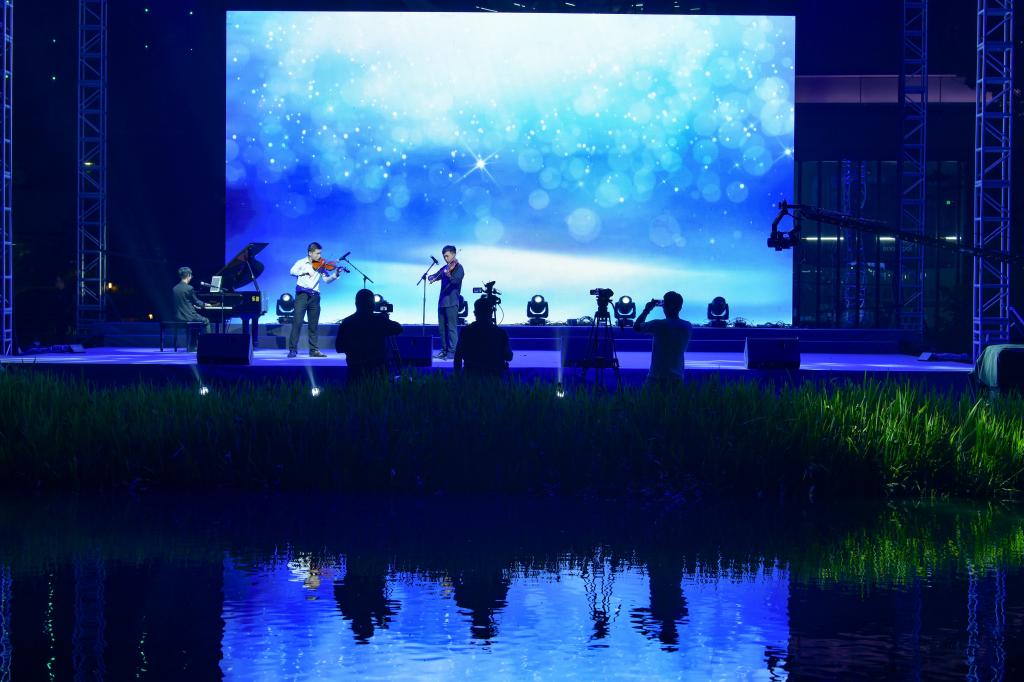 该场音乐会选址在前洋E商小镇的古运河畔,演出区与观众区隔河互动,水榭舞台倒影在大河中美奂美轮,琴声歌声掠过水面,与周边创业大楼形成的天然环形剧场中回荡,给现场观众美的享受,虽然夏日的雨丝陆陆续续,观众的热情一直高涨。