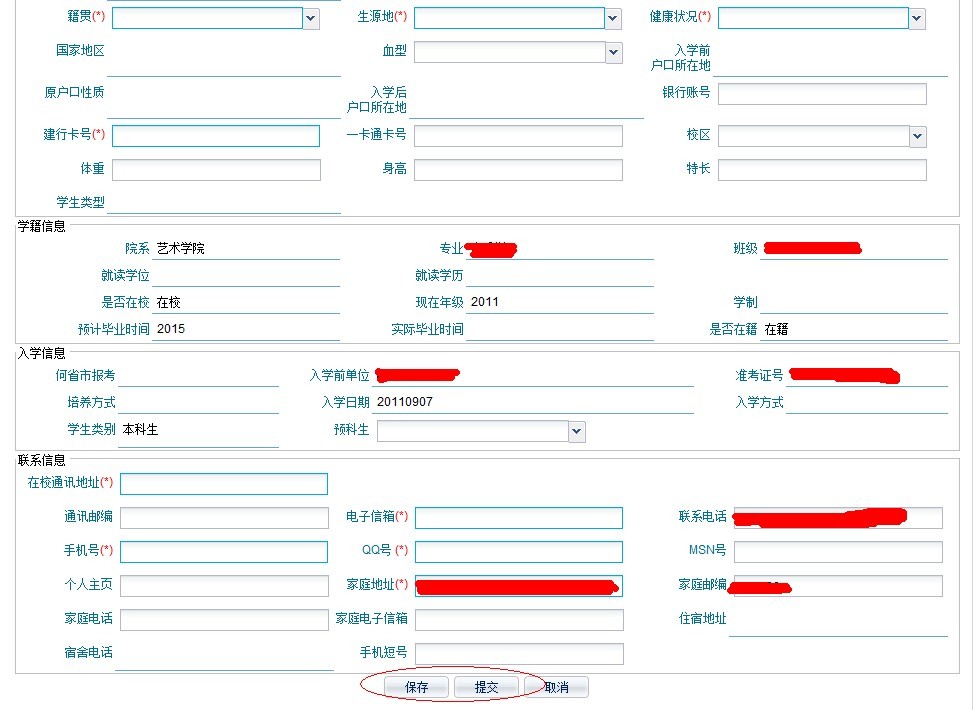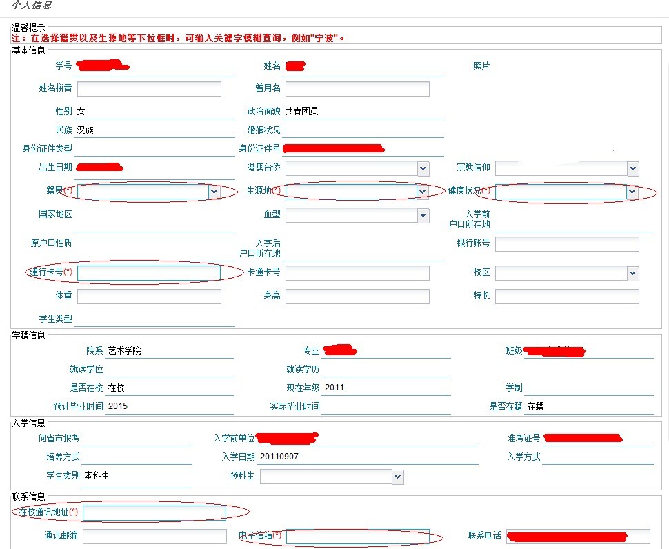 修改信息界面(划横线部分无法自己修改,有误请联系学工办王老师;对话框部分可自行修改或填补,带红色星号的对话框请务必按实将信息填写完整,其他对话框尽可能填写完整。籍贯生源地等为下拉菜单选择,在校通讯地址填写本人寝室地址,如西区公寓1号楼xxx。)