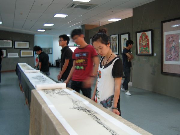 本次展览的参展作品为09、10级美术学专业学生的平时作业,有国画、油画、书法、电脑美术、民间艺术、平面设计等。国画主要以传统的山水画和花鸟画为主,山水画有手卷长达数米,令观者赞叹。工笔花鸟画有荷花如出水芙蓉等,色彩富丽堂皇,线条细腻有力。工艺设计作品视觉效果显著,设计想象力丰富,民间剪纸艺术和仿蜡染花布非常有特色。只要你到了展厅,就能感受到艺术殿堂的音符在环绕着你……