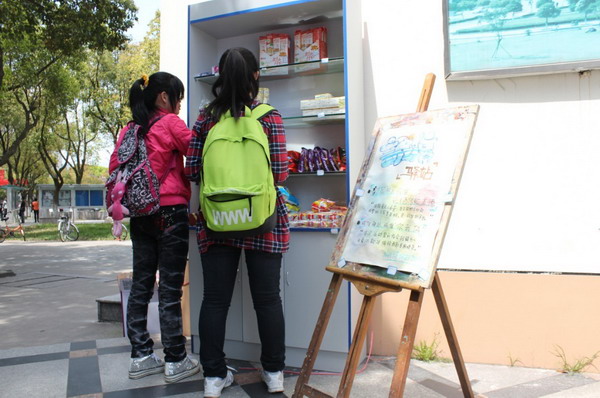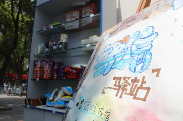 分团委设立的“诚信驿站”。小柜边上立着一块广告牌,上面说明了“诚信驿站”设立的目的意义供师生们参阅。所有收入皆以宁波大学的名义,捐献给需要帮助的西南贫困山区的孩子们。驿站由专人负责维护,每天定时定点进行检查和整理,填充货物、清单货品数量及收入。目前运转情况基本良好。