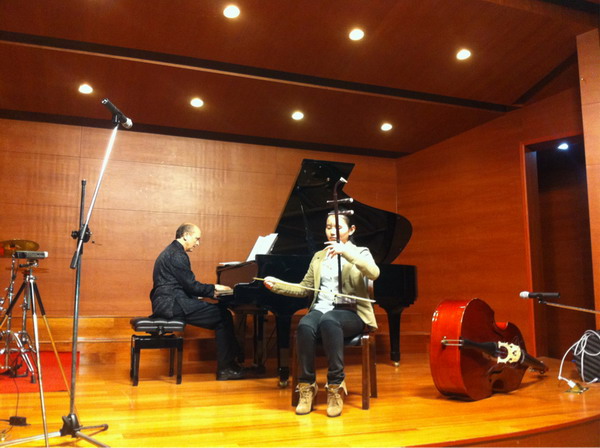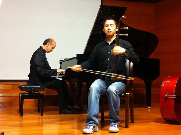 演奏二胡的学生合作演出了《除夕小唱》和《江河水》等曲目,他凭着自己对中国音乐的理解和作品风格特征的把握,进行了再创作,新颖的和声融合了中西方的音乐语汇,丰富了音乐的层次,给音乐注入了新的活力。