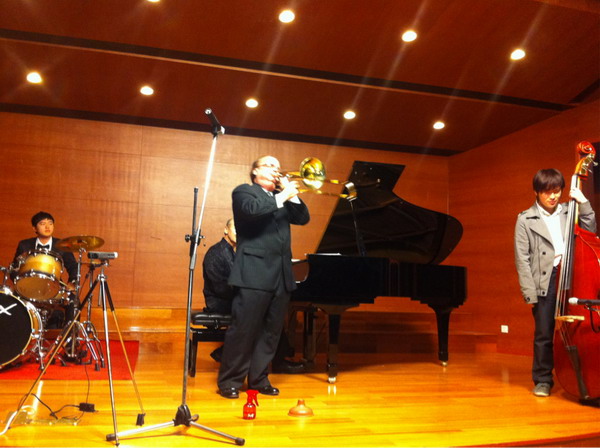 博内特·汤普森先生是美国著名的爵士钢琴家、作曲家和教育家。他不仅拥有精湛高超的琴艺,还有着高尚的情操。他自费由遥远的美国来到宁波大学教授学生。他的课由于他的个人魅力以及充分的备课展现出一幅幅精彩的动人画面,每节课前,博内特先生都会进行充分的备课准备,并将资源共享在他的个人网站上,以保证每个学生可以清楚了解到上课的进程。为此,他经常工作一整晚,熬夜为学生做课件编写课程安排。这次他在宁大进行为期四天的讲学和演出活动,他辛勤地忙碌着他的音乐,他总是早上给学生上课,下午排练他的音乐会节目,时间排得满满的。短短四天内,他同歌手、二胡、长号、贝司等完成了整场音乐会的排练。学生们发自内心的说:“他真的是一位严谨认真负责博学的好老师,我们欢迎这位伟大的老师,喜欢他给我们带来更多更好的爵士乐知识”。(钟青)