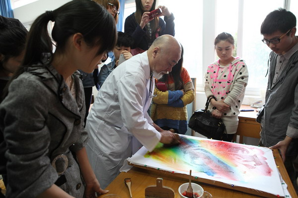 斋藤光弥先生在本次讲座中延续了去年到访时的讲学内容,重点就日本传统染色工艺做了比较具体的介绍,在讲座中他还现场演示了“型版染色”的工艺过程和染色技巧,并有选择地让同学们参与其中,给现场师生留下了深刻的印象。