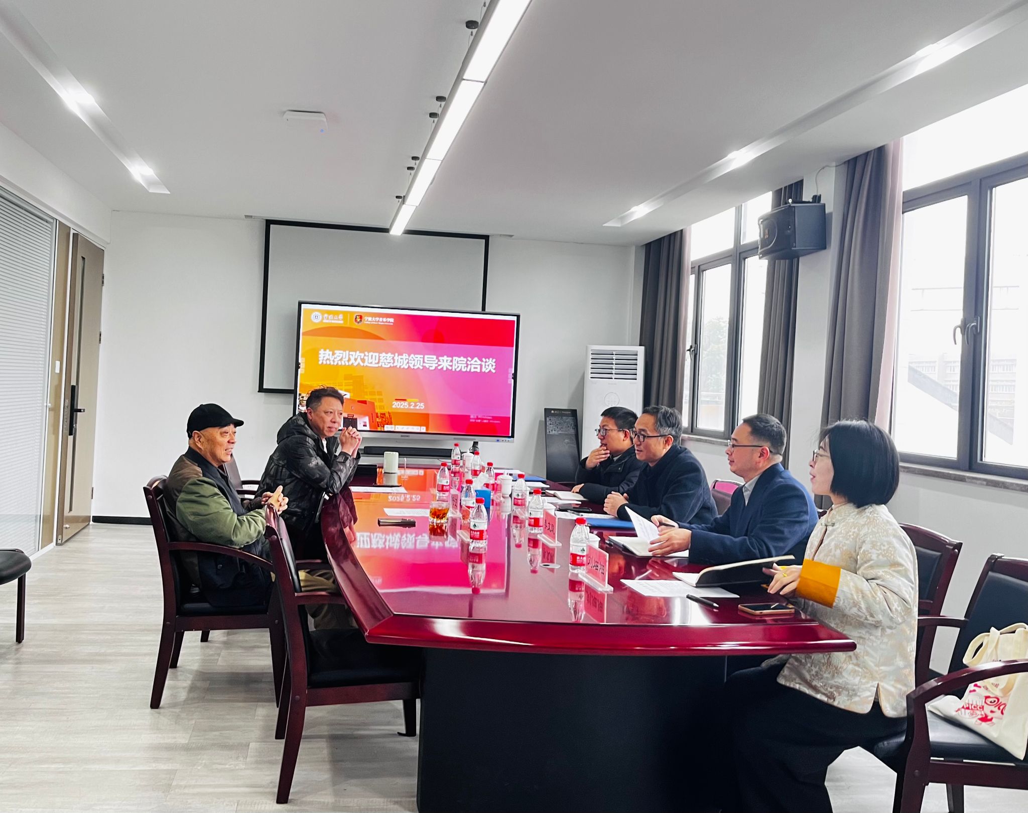2月25日上午,宁波市江北城投集团有限公司总经理助理胡波、江北区慈城镇党建办主任黄利军一行来我院洽谈,音乐学院特聘院长俞子正、副院长刘畅等参加会议。