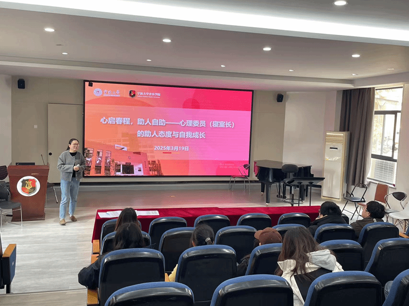为提升学生干部心理助人能力,赋能朋辈关怀,助力其在助人与自助中双向成长,2025年3月19日,音乐学院联合校心理健康指导中心,特邀资深心理咨询师朱婷老师为学院心理委员及寝室长开展主题为“心启春程,助人自助——心理委员(寝室长)的助人态度与自我成长”的专题培训。