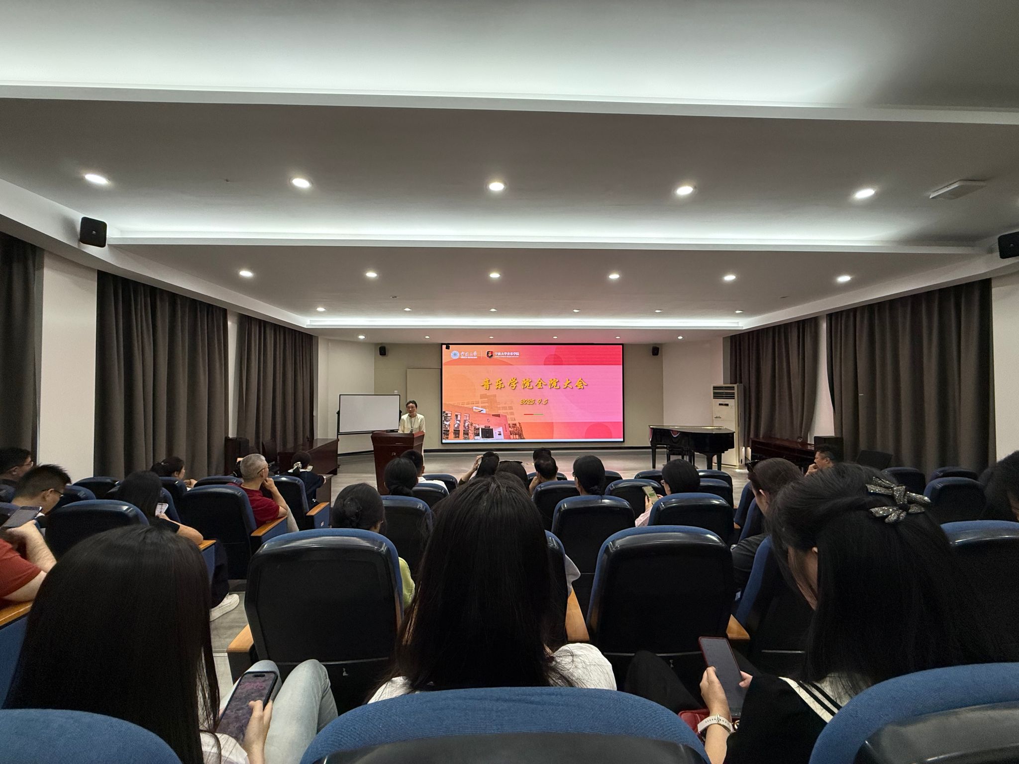 随后副院长王蕾回顾了上半年及暑期期间音乐学院各方面取得的成绩,并对下半年学院在教学管理、教资考试、保研工作、招生情况、学科建设、比赛成果及近期活动进行工作安排。学院副院长刘畅就研究生教学、导师遴选与招生、科研、校地合作、地方服务等工作作出部署。