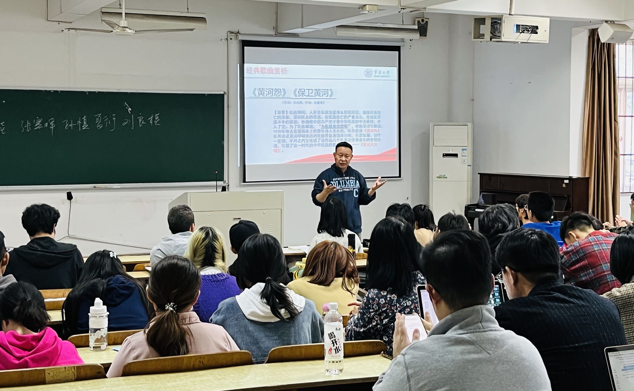 本次公开观摩课的课程名称为《经典歌曲赏析》,是面向全校所有学生开设的通识类课程。课程教学主题为“起来,不愿做奴隶的人们”,从《五月的鲜花》、《松花江上》、《义勇军进行曲》、《黄河怨》、《保卫黄河》等经典红色歌曲入手,串联出中华儿女从抗日战争到新中国成立这一段段历史,以及在这期间涌现出来的一批人民音乐家,用歌曲来谱写心中的爱国热情。 课堂上,学生互动氛围极佳,展示了音乐与历史相互碰撞共鸣,课上还展示了师生大合唱,赢得了在场观摩老师的一致好评。