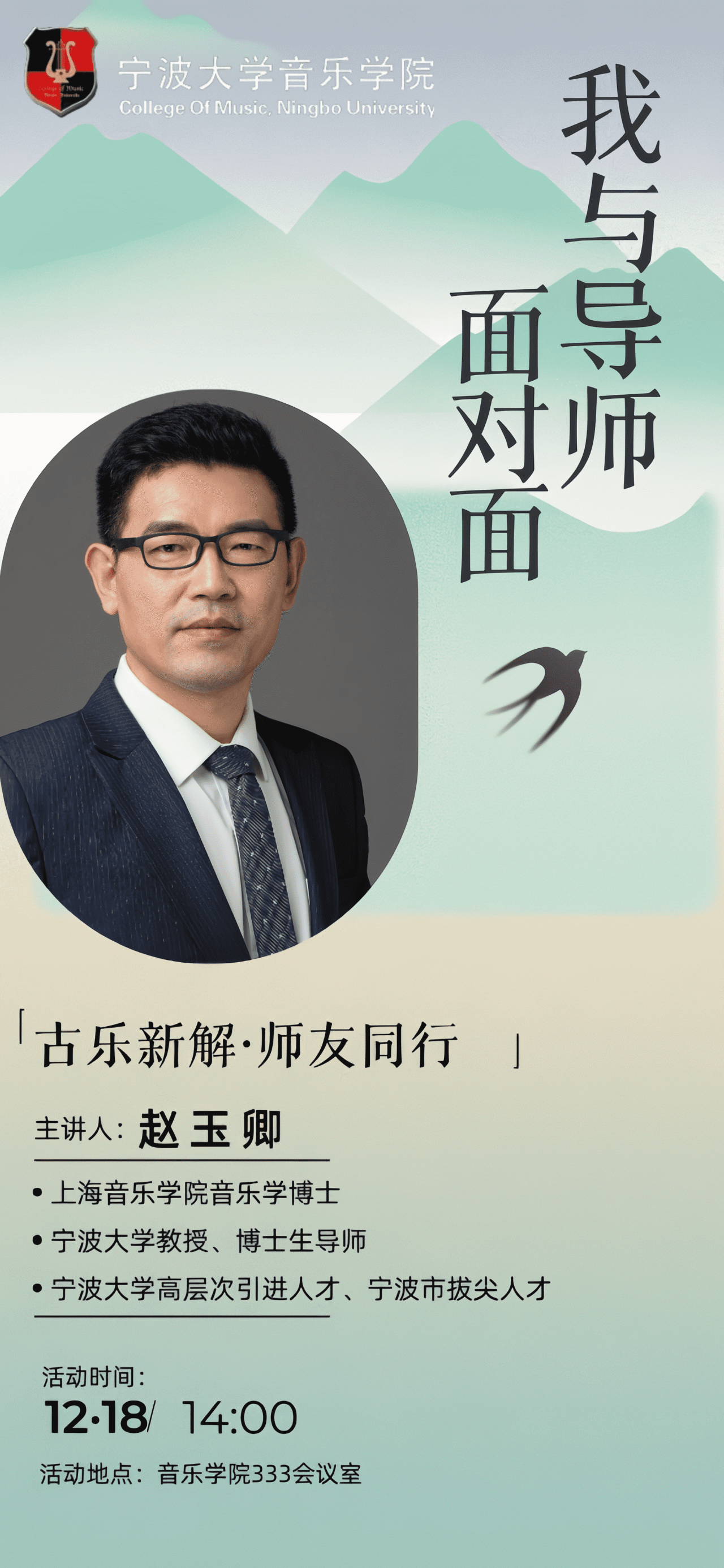 为进一步加强我院研究生与导师之间的沟通交流,培养学生的科研思辨能力,激发研究生的学术热情和探索精神,音乐学院即将举办“我与导师面对面”研究生思政品牌系列活动第18期——“古乐新解·师友同行”师生座谈会,本次特别邀请赵玉卿教授及其研究生团队,用新颖的视角解读传统曲目,让古老旋律焕发新生,讲述中国音乐史的独特魅力。诚挚邀请感兴趣的师生到场参与,期待与您在现场相见!