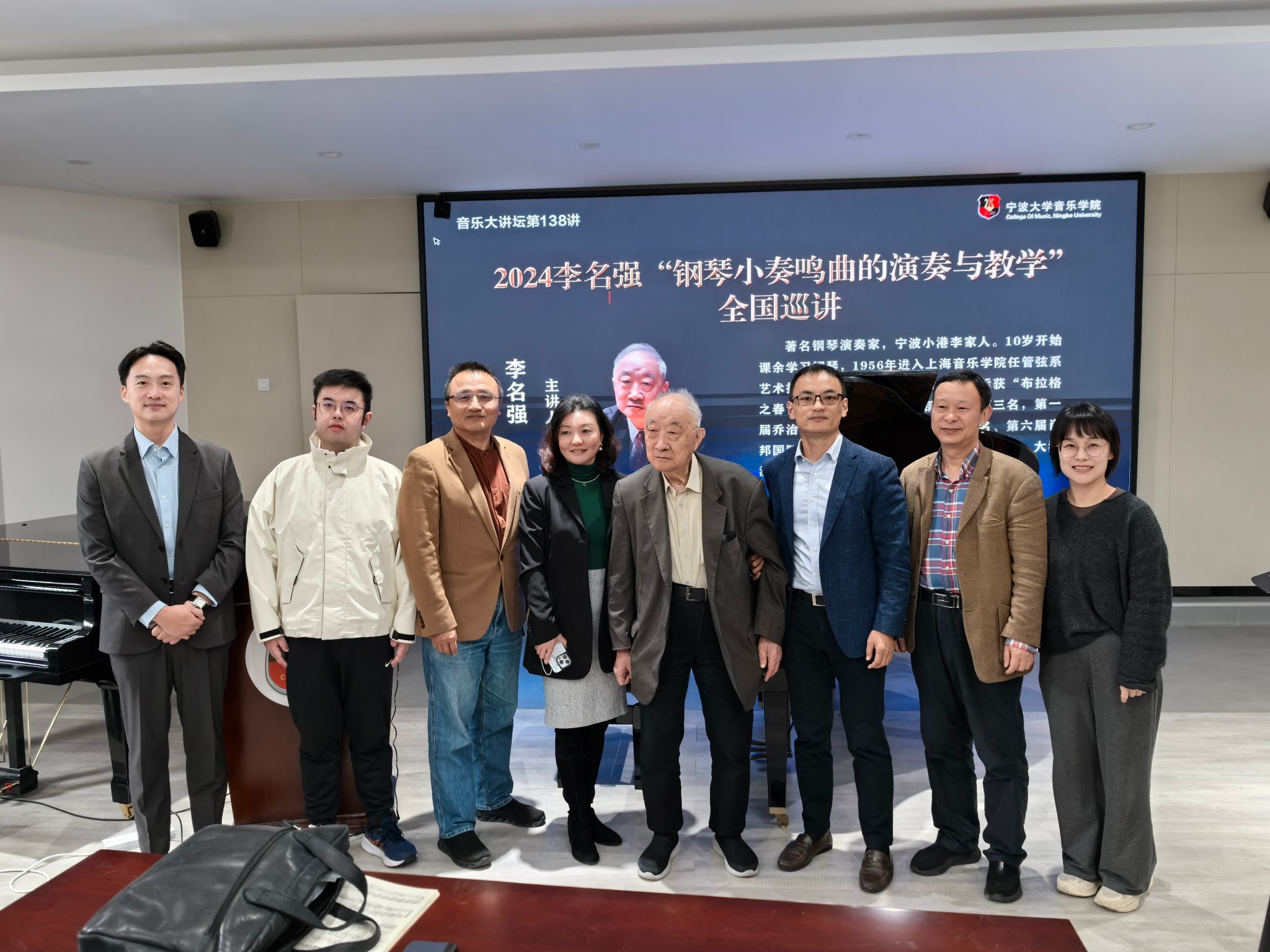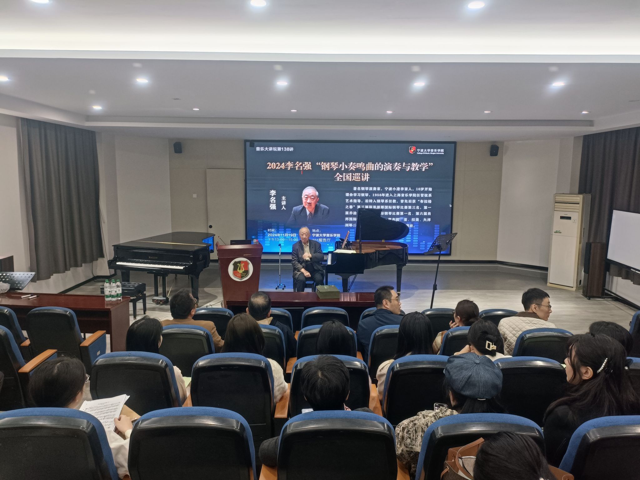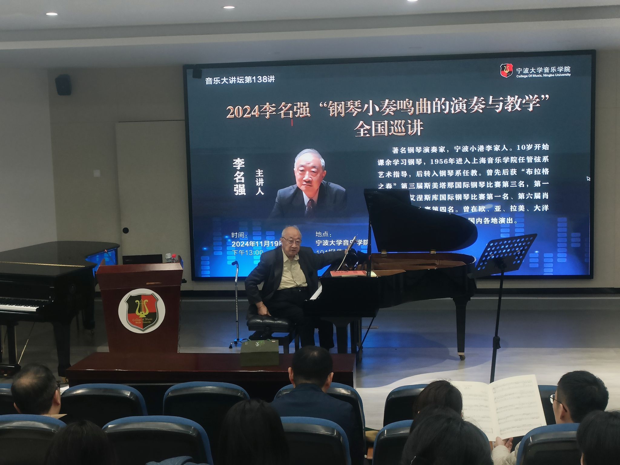 2024年11月19日 下午,著名钢琴演奏家李名强在宁波大学音乐学院101报告厅举办《2024李名强“钢琴小奏鸣曲的演奏与教学”全国巡讲》大师班,音乐学院部分师生进行了现场观摩。李名强,著名钢琴演奏家,宁波小港李家人。10岁开始课余学习钢琴,1956年进入上海音乐学院任管弦系艺术指导,后转入钢琴系任教。曾先后获“布拉格之春”第三届斯美塔那国际钢琴比赛第三名,第一届乔治·艾涅斯库国际钢琴比赛第一名、第六届肖邦国际钢琴比赛第四名。曾在欧、亚、拉美、大洋洲等二十多个国家、地区及国内各地演出。
