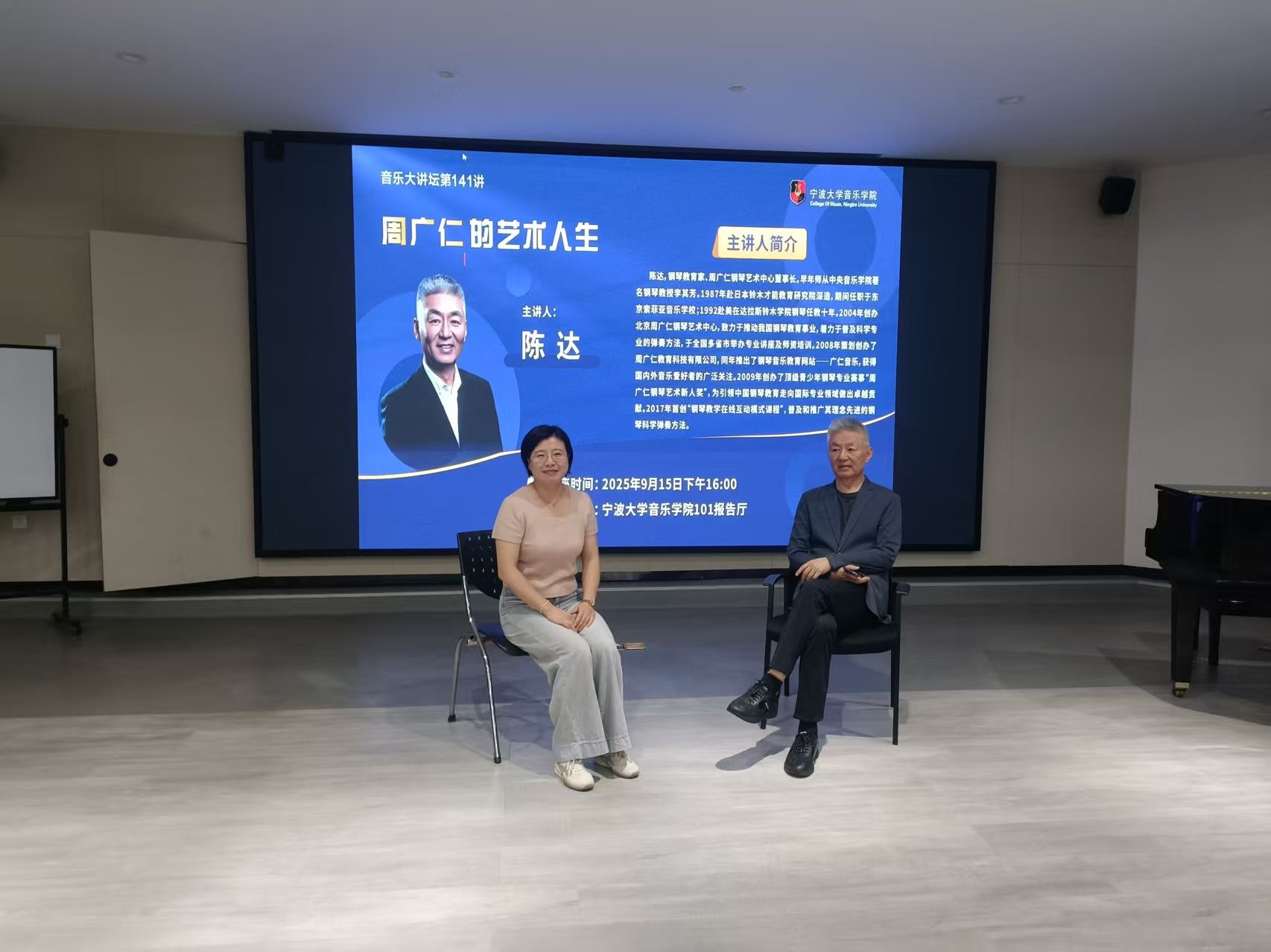 2025年9月15日,音乐学院邀请钢琴教育家、周广仁钢琴艺术中心董事长陈达做客音乐大讲坛第141讲,为学院师生做题为《周广仁的艺术人生》的学术讲座。陈达,钢琴教育家、周广仁钢琴艺术中心董事长。早年师从中央音乐学院著名钢琴教授李其芳。1987年赴日本铃木才能教育研究院深造,期间任职于东京索菲亚音乐学校;1992赴美在达拉斯铃木学院钢琴任教十年。2004年创办北京周广仁钢琴艺术中心,致力于推动我国钢琴教育事业,着力于普及科学专业的弹奏方法,于全国多省市举办专业讲座及师资培训。2008年策划创办了周广仁教育科技有限公司,同年推出了钢琴音乐教育网站——广仁音乐,获得国内外音乐爱好者的广泛关注。2009年创办了顶级青少年钢琴专业赛事“周广仁钢琴艺术新人奖”,为引领中国钢琴教育走向国际专业领域做出卓越贡献。2017年首创“钢琴教学在线互动模式课程”,普及和推广其理念先进的钢琴科学弹奏方法。