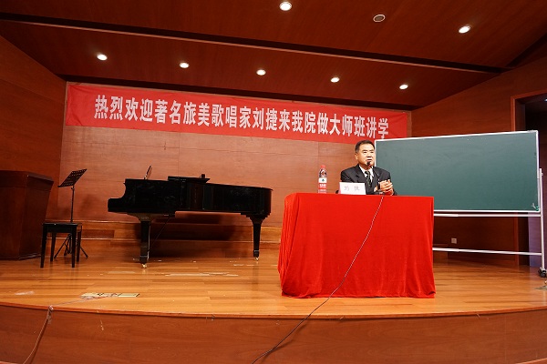 小音乐厅为学院师生进行了两个多小时的声乐大师班学术讲座。刘捷教授首先从"唱歌"、"声乐"和"美声"三个歌唱名词入手,系统剖析了多年来国内混淆不清的概念性误区,通过黑板图示完整阐述了传统意大利Bel Contto(美声)特有的发展历程及其严格的技术性要求。指出Bel Contto只是特定时期意大利出现的一种炫技性演唱技巧,不代表现代歌唱技术的全部。指出好的歌唱不能仅靠好的嗓音条件来决定,也不能只停留在对意大利语言的掌握上,而是需要严格系统的技术性训练才能逐渐形成强大的歌唱能力,否则歌唱生命必将受到影响。同时强调技术不受语言、人种及年龄等因素限制,好的技术应该能胜任任何语言作品的演唱,要通过好的技术演唱自己本国的声乐作品,而演唱技巧的提高没有任何捷径,惟有长期坚持训练及自我反思才能逐渐提升。讲座中,刘捷教授还对三种"唱法"提法给予否定,并对目前拔苗助长缺乏基本功的跳跃式培养方式进行了尖锐的批评。