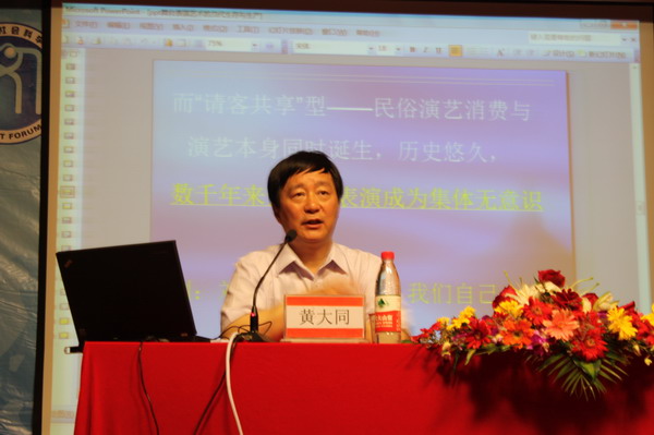 在讲座中,黄教授首先从既存演艺消费类型入手,将其分为“自付自享” 的商业演艺消费和“请客共享”的民俗演艺消费,通过具体的案例剖析和理性的分析,提出民俗演艺消费是生活的组成部分,并已成为我国当代演艺消费结构中的主流形态。同时,黄教授还介绍了艺术生产的定位及其对策,如:出精品(根据领导和评委的标准生产)、走市场(根据大多数人的口味生产)、非遗传承(根据文物的要求尽可能原样传承)等模式,但要求这三个类别要分流,不能在一个剧目里有三个目标要求。