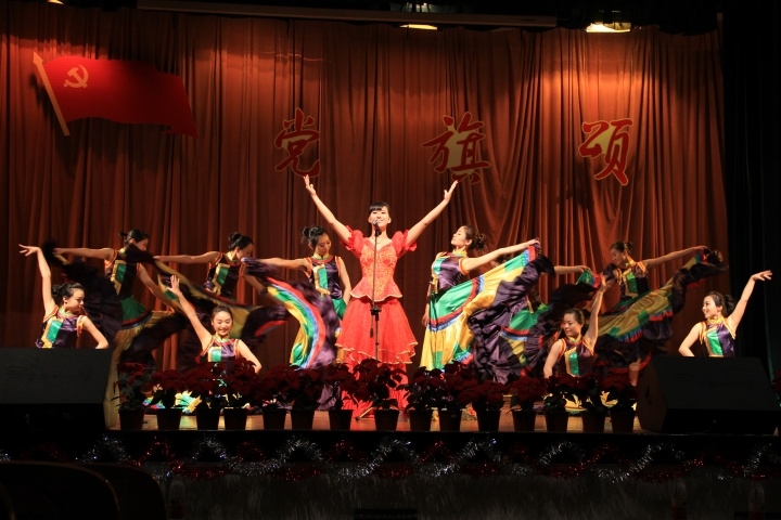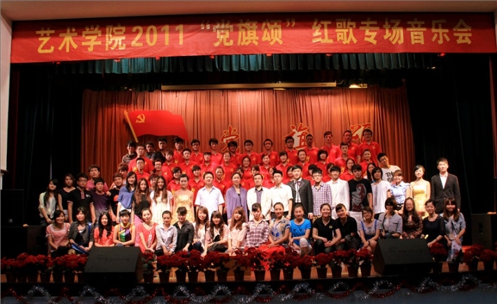 在锦绣小剧场举行了宁波大学首届周末锦绣文化航班第六站——“党旗颂”红歌专场音乐会。本次音乐会以“丹青描绘坚忍志、青春高歌红色魂”为主题,向建党九十周年献上了艺院人的一份珍贵礼物。院长喻辉、院党委书记袁虹、副书记叶春桥等学院领导和校团委毛璇老师、各学院分团委书记、学生会主席以及近300名师生观看了晚会。