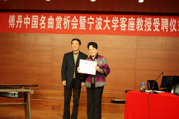 3月30日下午,傅丹“中国名曲赏析会”暨宁波大学客座教授受聘仪式在西校区小音乐厅举行。校党委书记程刚出席仪式,为傅丹颁发聘书并佩戴校徽。