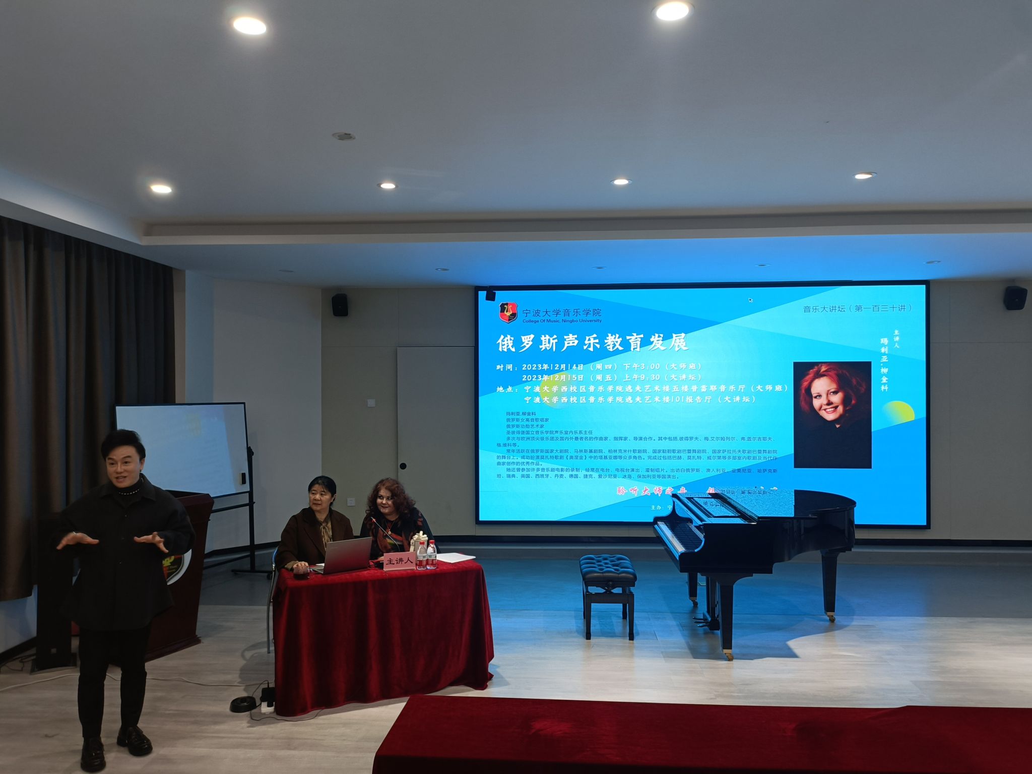 2023年12月14日下午、15日上午,宁波大学音乐学院迎来了两场声乐盛会。俄罗斯女高音歌唱家、著名艺术家、圣彼得堡国立音乐学院声乐室内乐系主任玛利亚·柳金科莅临校园,在逸夫艺术楼五楼普雷耶音乐厅和一楼101报告厅分别举办声乐大师班和主题为《俄罗斯声乐教育发展》的音乐大讲坛。