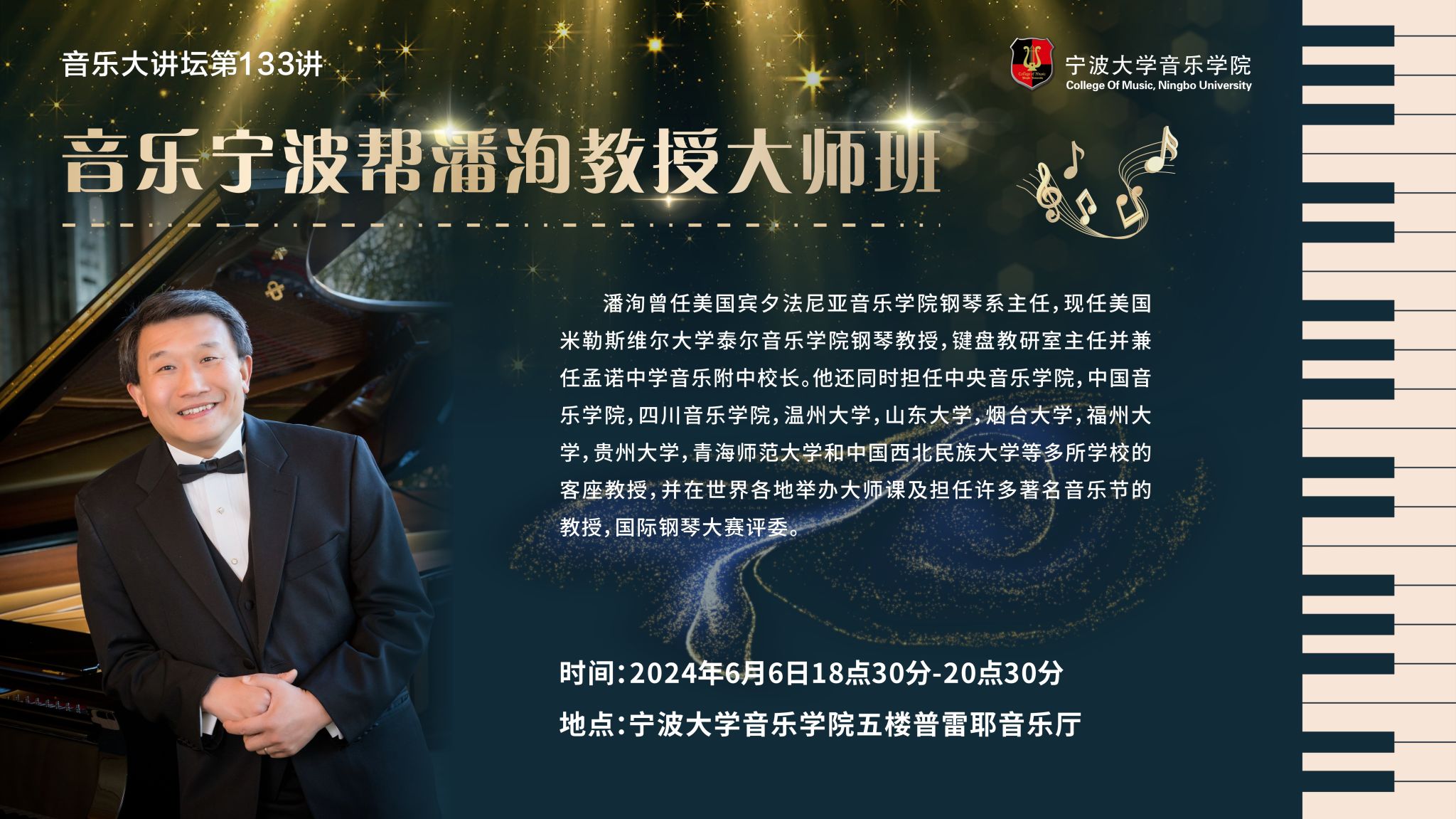 主讲人简介:潘洵曾任美国宾夕法尼亚音乐学院钢琴系主任,现任美国米勒斯维尔大学泰尔音乐学院钢琴教授,键盘教研室主任并兼任孟诺中学音乐附中校长。他还同时担任中央音乐学院,中国音乐学院,四川音乐学院,温州大学,山东大学,烟台大学,福州大学,贵州大学,青海师范大学和中国西北民族大学等多所学校的客座教授,并在世界各地举办大师课及担任许多著名音乐节的教授,国际钢琴大赛评委。