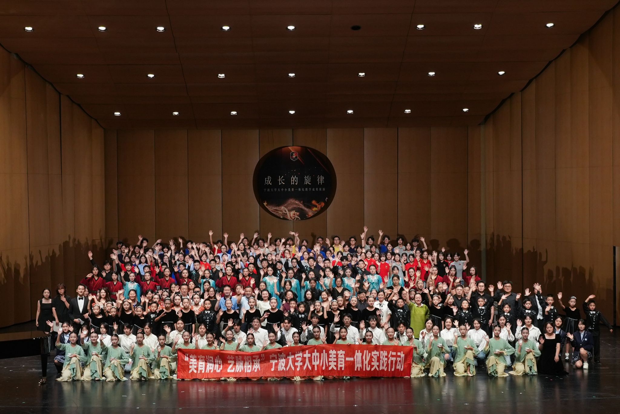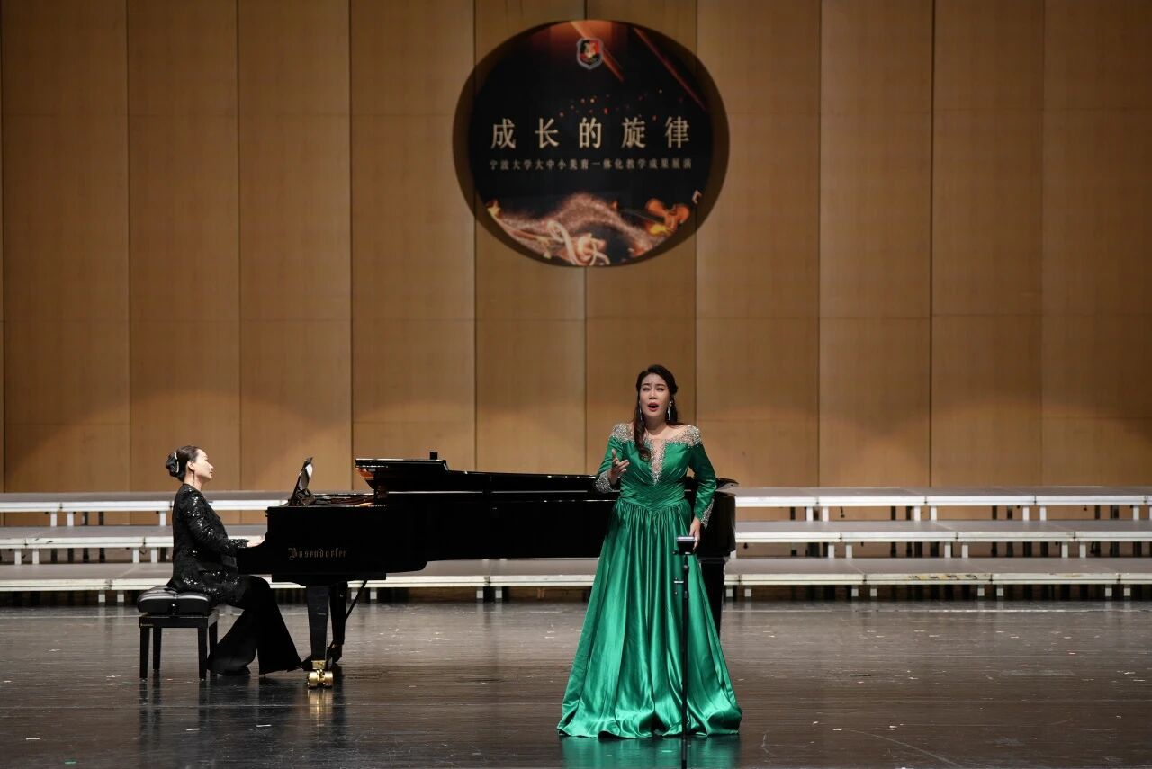 在东海之滨的宁波,一场以音乐与美育为纽带的教育教学改革正悄然发生。2025年9月17日晚,由宁波大学音乐学院主办、宁波市教育局教研室协办,宁波市鄞州中学、四明中学、外国语学校(浙江省八一学校)、镇安小学共同合作的“成长的旋律——大中小美育一体化教学成果展演”在宁波文化广场大剧院隆重举行。这不仅是一场“大中小学”协同演绎的艺术盛会,更是宁波大学音乐学院“大中小美育一体化实践基地”建设的重要成果,是学院多年来积极推进美育贯通式培养、打破学段壁垒教学成效的集中展现。