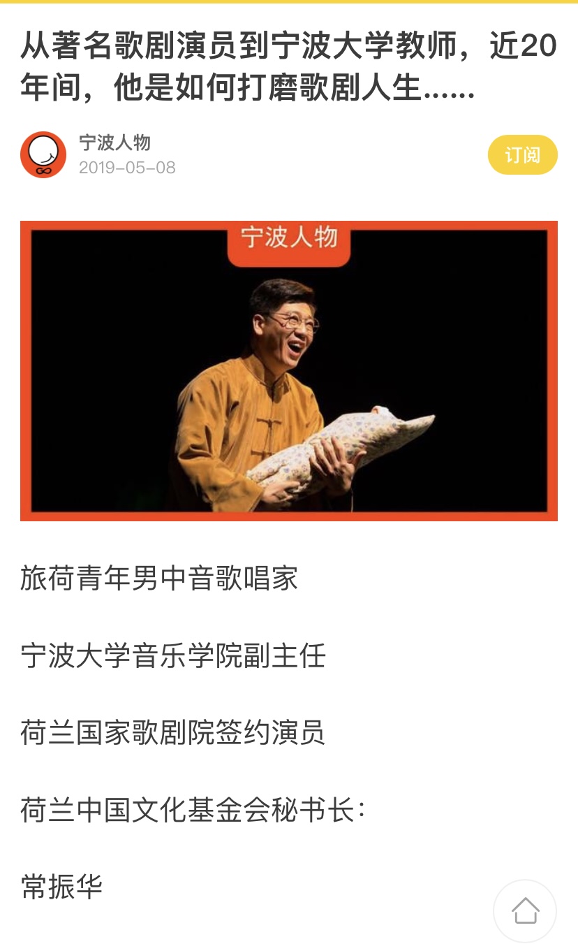 常振华老师作为旅荷青年男中音歌唱家、荷兰国家歌剧院签约演员、荷兰中国文化基金会秘书长接受了《宁波人物》题为“从著名歌剧演员到宁波大学教师,近20年间,他如何打磨歌剧人生”的专访。