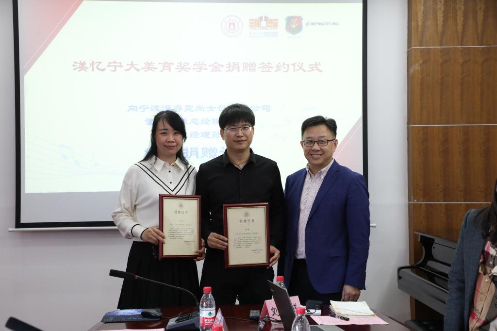 10月29日下午,时值宁波大学建校35周年暨三校合并25周年之际,宁波大学美育教育中心与宁波漫睿霓尚女包有限公司签订“渼忆宁大美育奖学金”捐赠协议。我校俞子正、李国平、屠春飞、桂尚书、王蕾等人,及美育教育中心老师代表与音乐学院学生代表出席捐赠签约仪式。