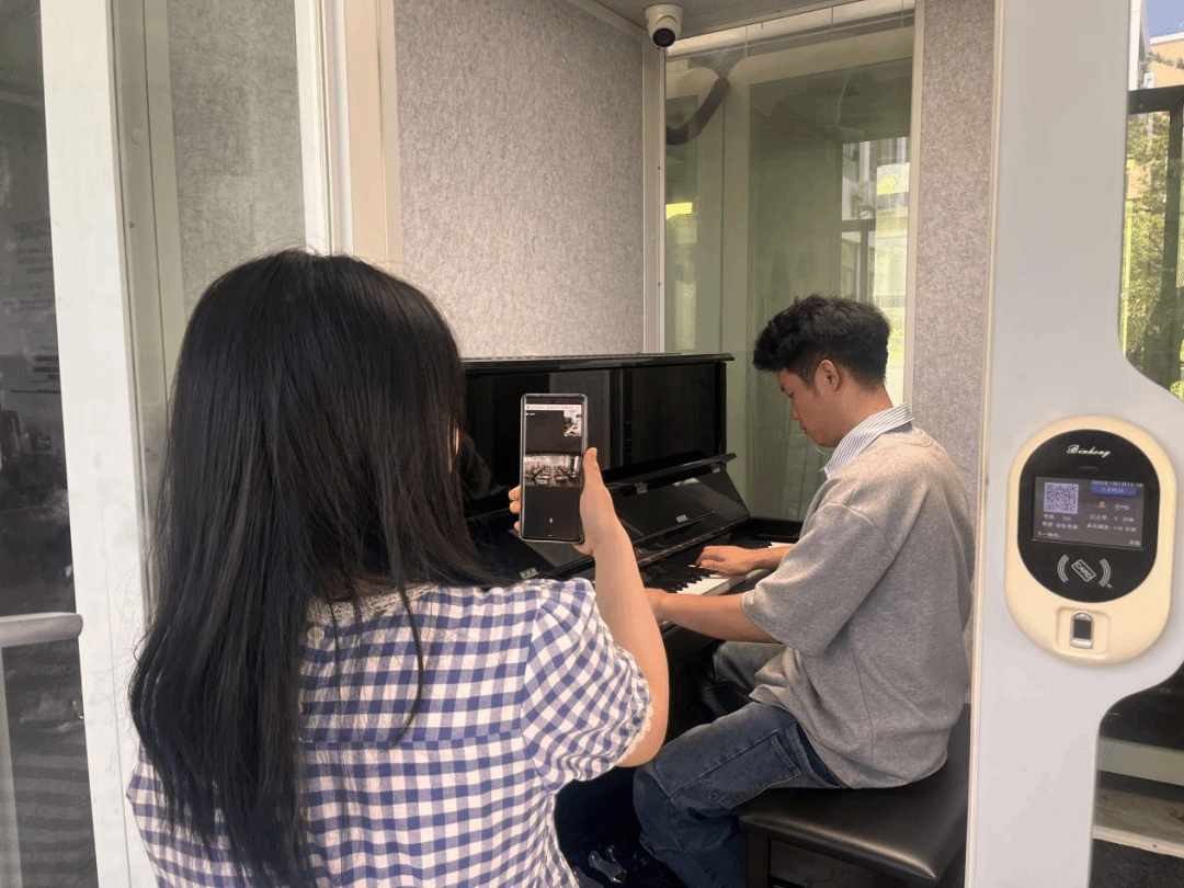7月2日,我院精心策划了一场云端音乐之旅。研究生欧阳国俊化身讲解员,带领晴隆六小的孩子们在线探访智慧琴房、乐器房与音乐厅。在智慧琴房,他详细介绍了智能教学系统、预约系统等功能,还现场展示了钢琴曲《肖邦降 b 小调夜曲》,让孩子们在悠扬琴声中感受古典音乐的魅力;方雨朵同学则以一曲琵琶《龙船》,展现属于中国民族音乐的独特韵味。