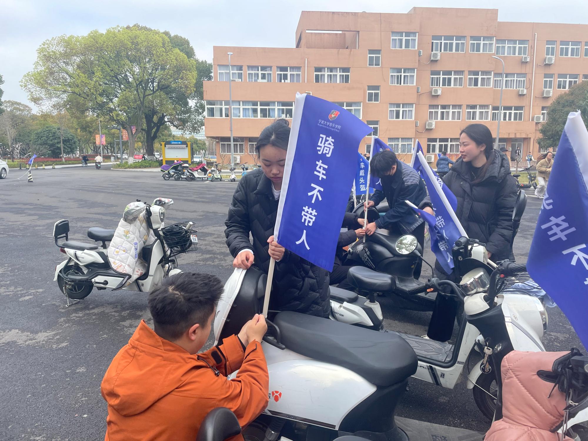 定制款头盔,在电瓶车上安装“骑车不带人”“骑车戴头盔”的安全宣传标语旗,形成了一道靓丽的风景线。