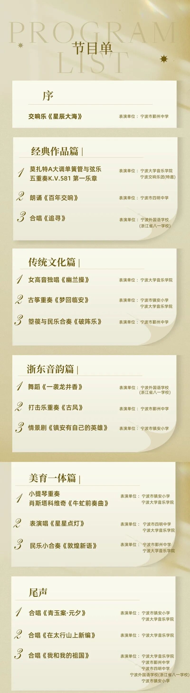 当童真与专业共鸣,当传承与创新碰撞,一场跨越学段的美育盛宴即将点燃艺术与教育的火花!2025年9月17日19:00,“成长的旋律”宁波大学大中小美育一体化教学成果展演将在宁波文化广场大剧院拉开帷幕。宁波大学音乐学院携手宁波市鄞州中学、宁波市四明中学、宁波外国语学校(浙江省八一学校)和宁波市镇安小学,通过音乐、舞蹈、戏剧等多元化的形式,全面呈现大中小美育一体化建设的创新实践与丰硕成果!