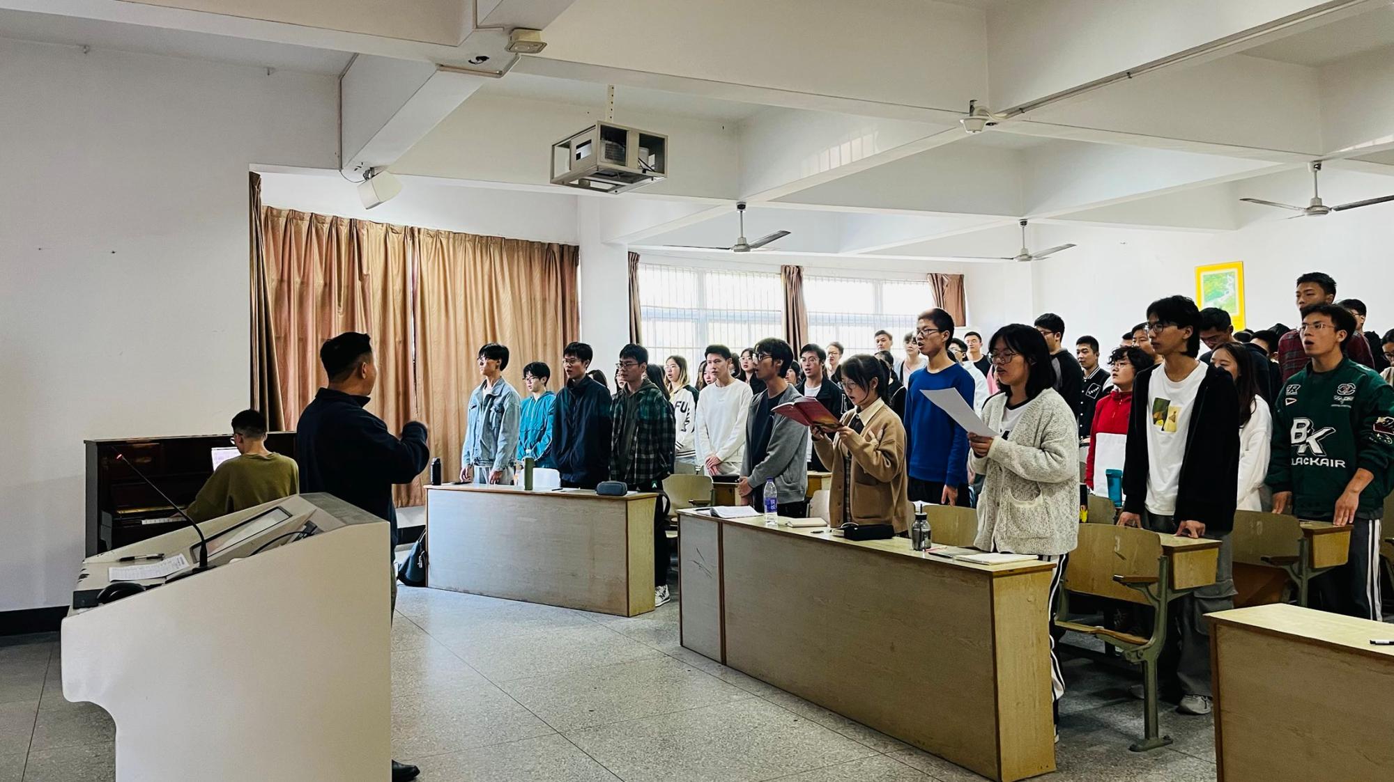 本次公开观摩课的课程名称为《经典歌曲赏析》,是面向全校所有学生开设的通识类课程。课程教学主题为“起来,不愿做奴隶的人们”,从《五月的鲜花》、《松花江上》、《义勇军进行曲》、《黄河怨》、《保卫黄河》等经典红色歌曲入手,串联出中华儿女从抗日战争到新中国成立这一段段历史,以及在这期间涌现出来的一批人民音乐家,用歌曲来谱写心中的爱国热情。 课堂上,学生互动氛围极佳,展示了音乐与历史相互碰撞共鸣,课上还展示了师生大合唱,赢得了在场观摩老师的一致好评。