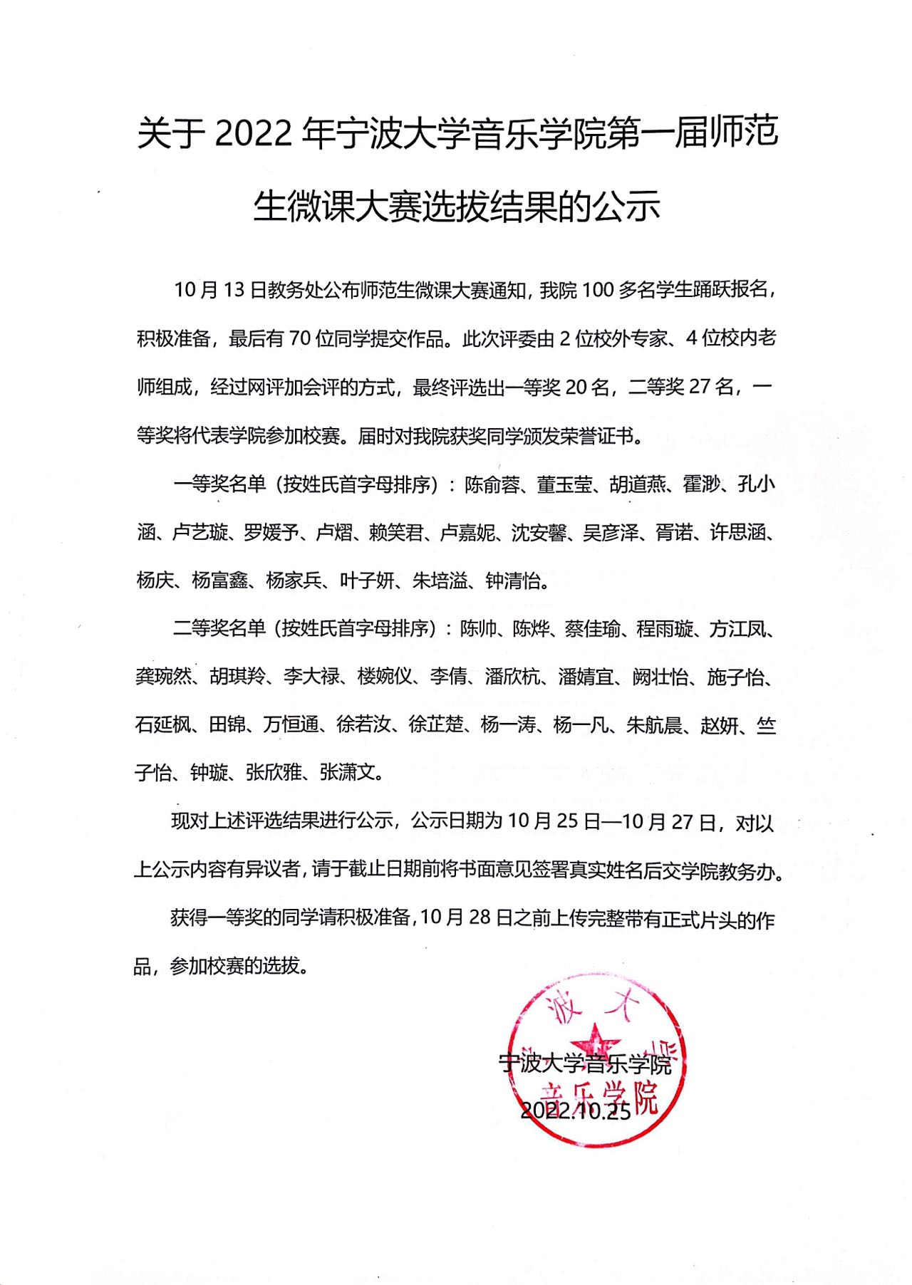 关于2022年宁波大学音乐学院第一届师范生微课大赛选拔结果的公示