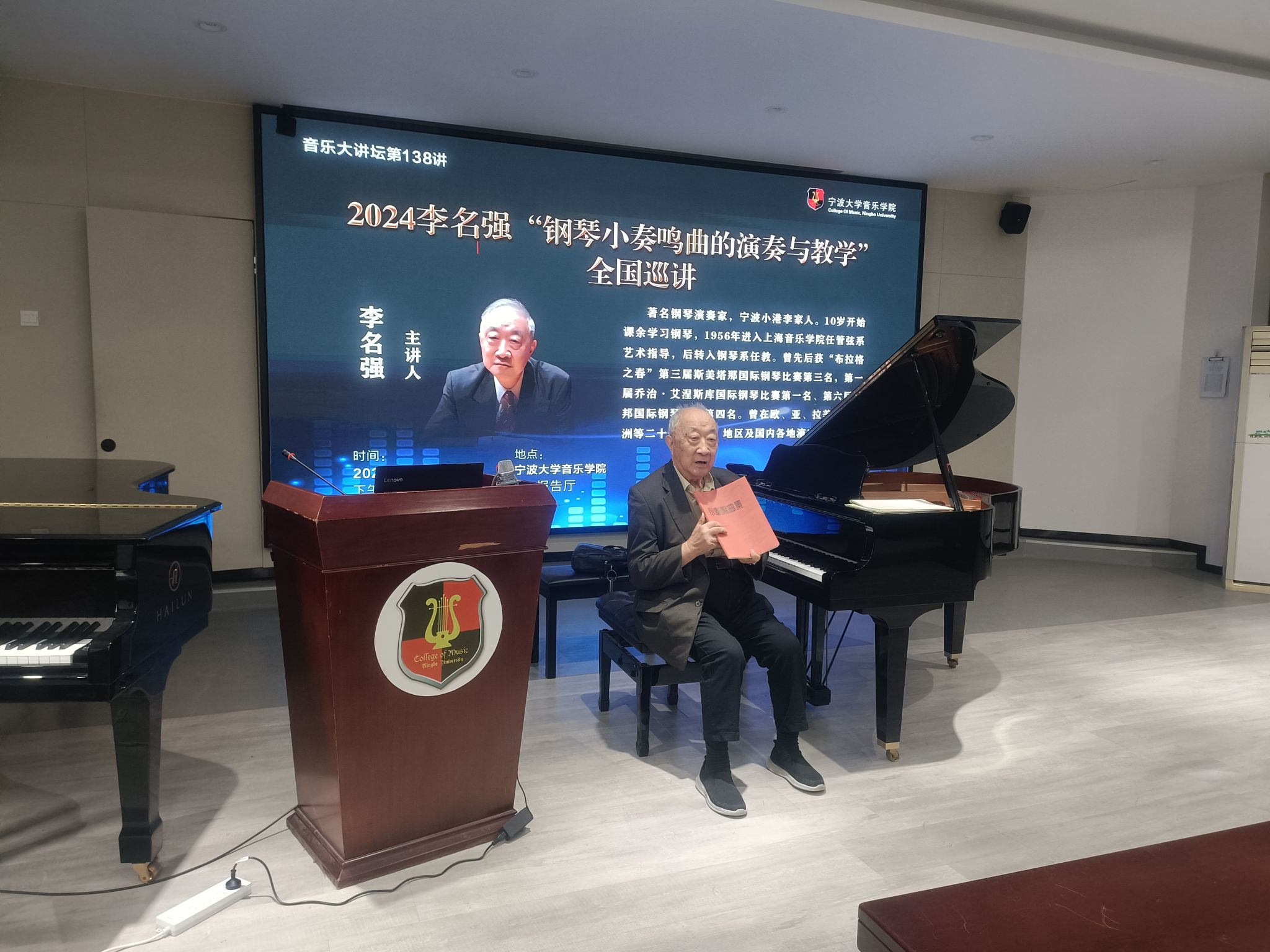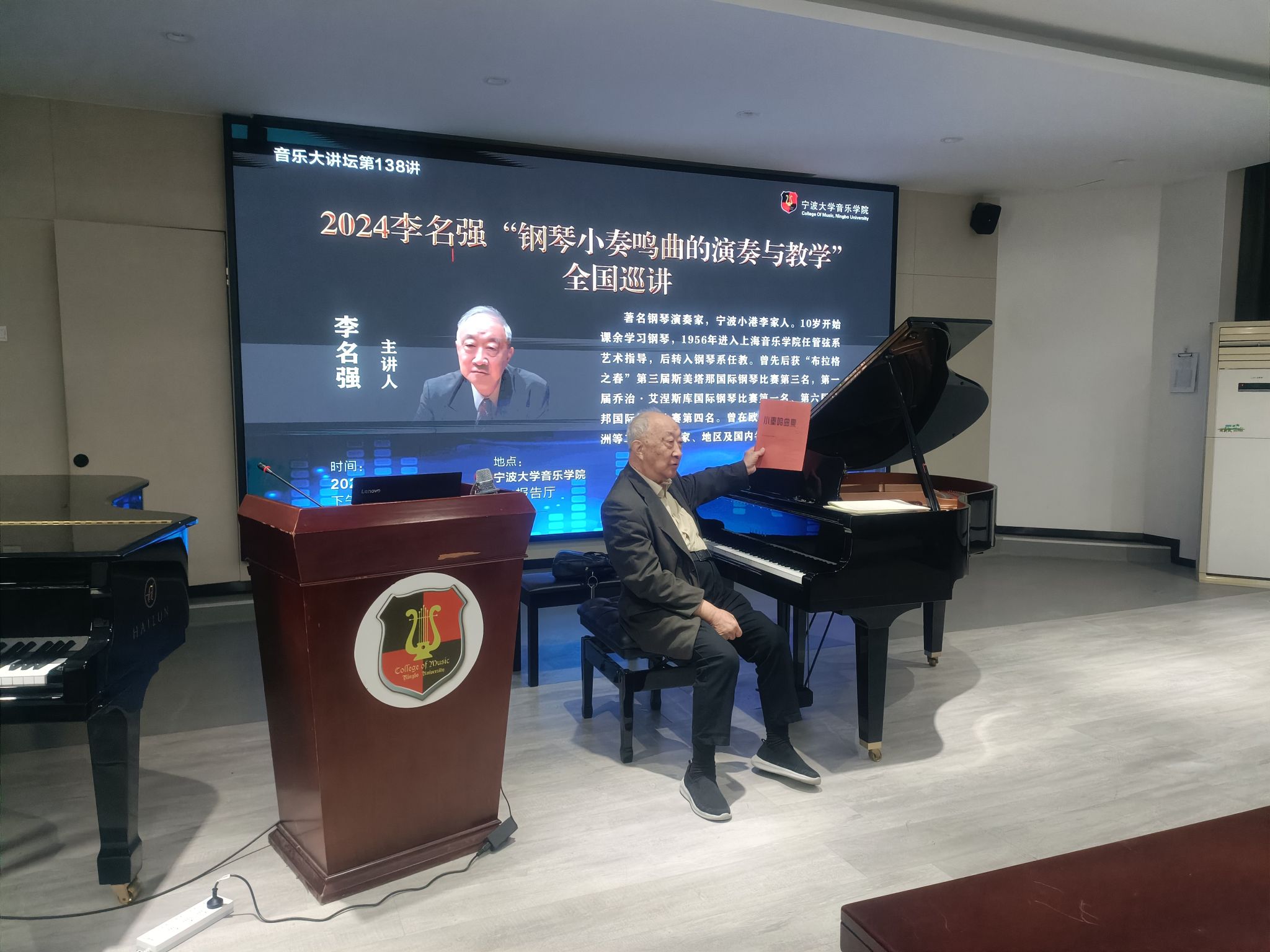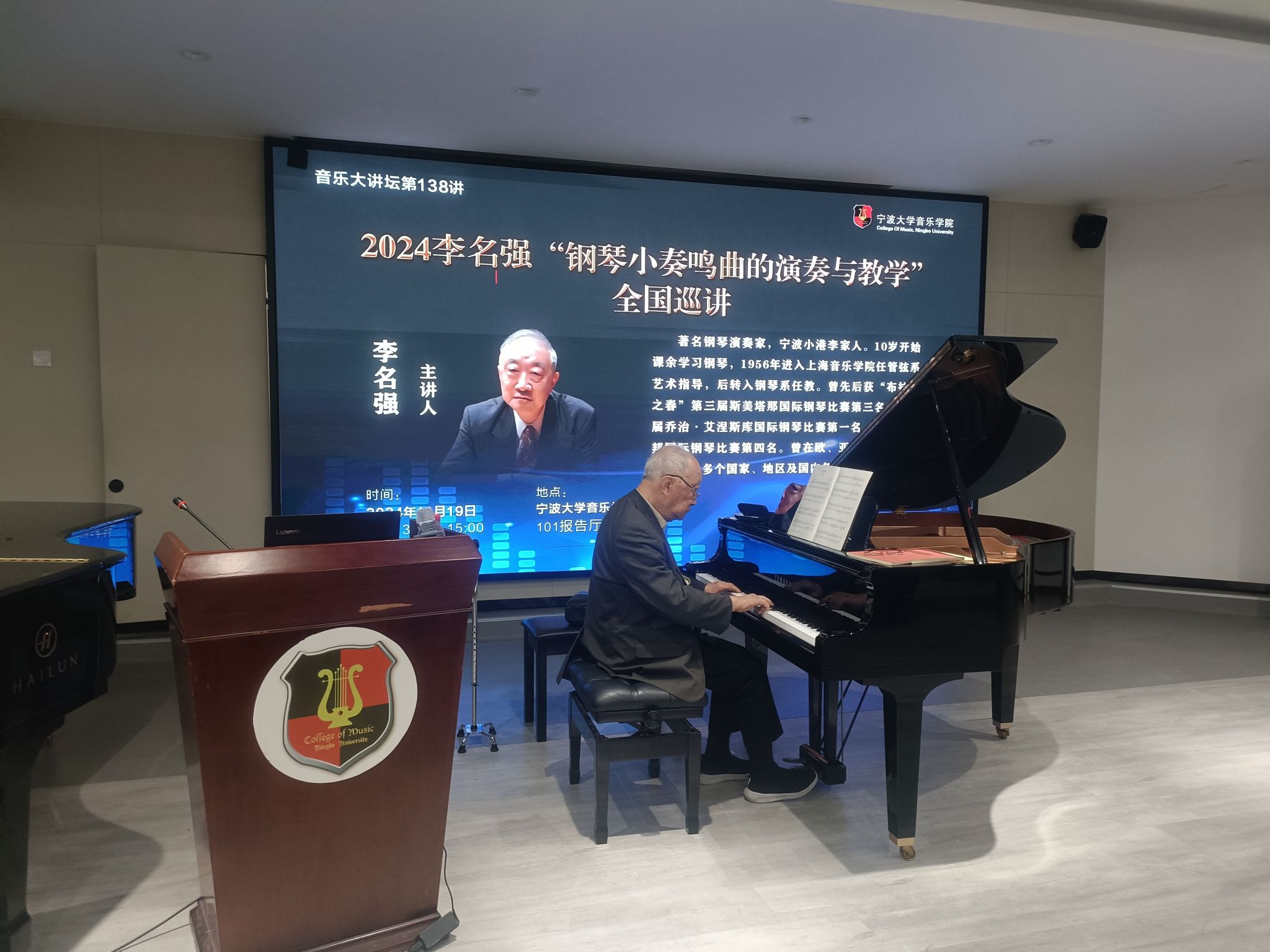 2024年11月19日 下午,著名钢琴演奏家李名强在宁波大学音乐学院101报告厅举办《2024李名强“钢琴小奏鸣曲的演奏与教学”全国巡讲》大师班,音乐学院部分师生进行了现场观摩。李名强,著名钢琴演奏家,宁波小港李家人。10岁开始课余学习钢琴,1956年进入上海音乐学院任管弦系艺术指导,后转入钢琴系任教。曾先后获“布拉格之春”第三届斯美塔那国际钢琴比赛第三名,第一届乔治·艾涅斯库国际钢琴比赛第一名、第六届肖邦国际钢琴比赛第四名。曾在欧、亚、拉美、大洋洲等二十多个国家、地区及国内各地演出。