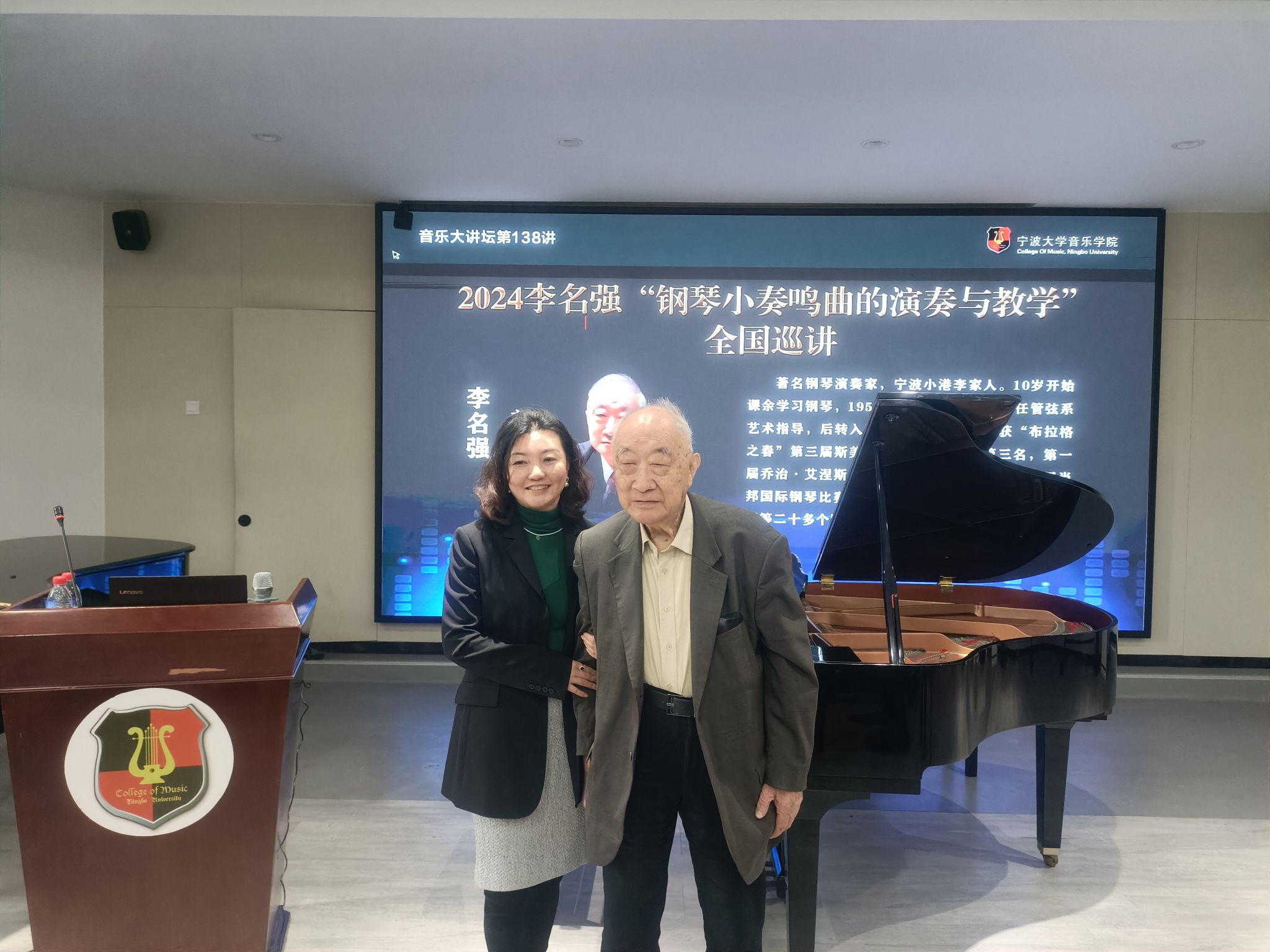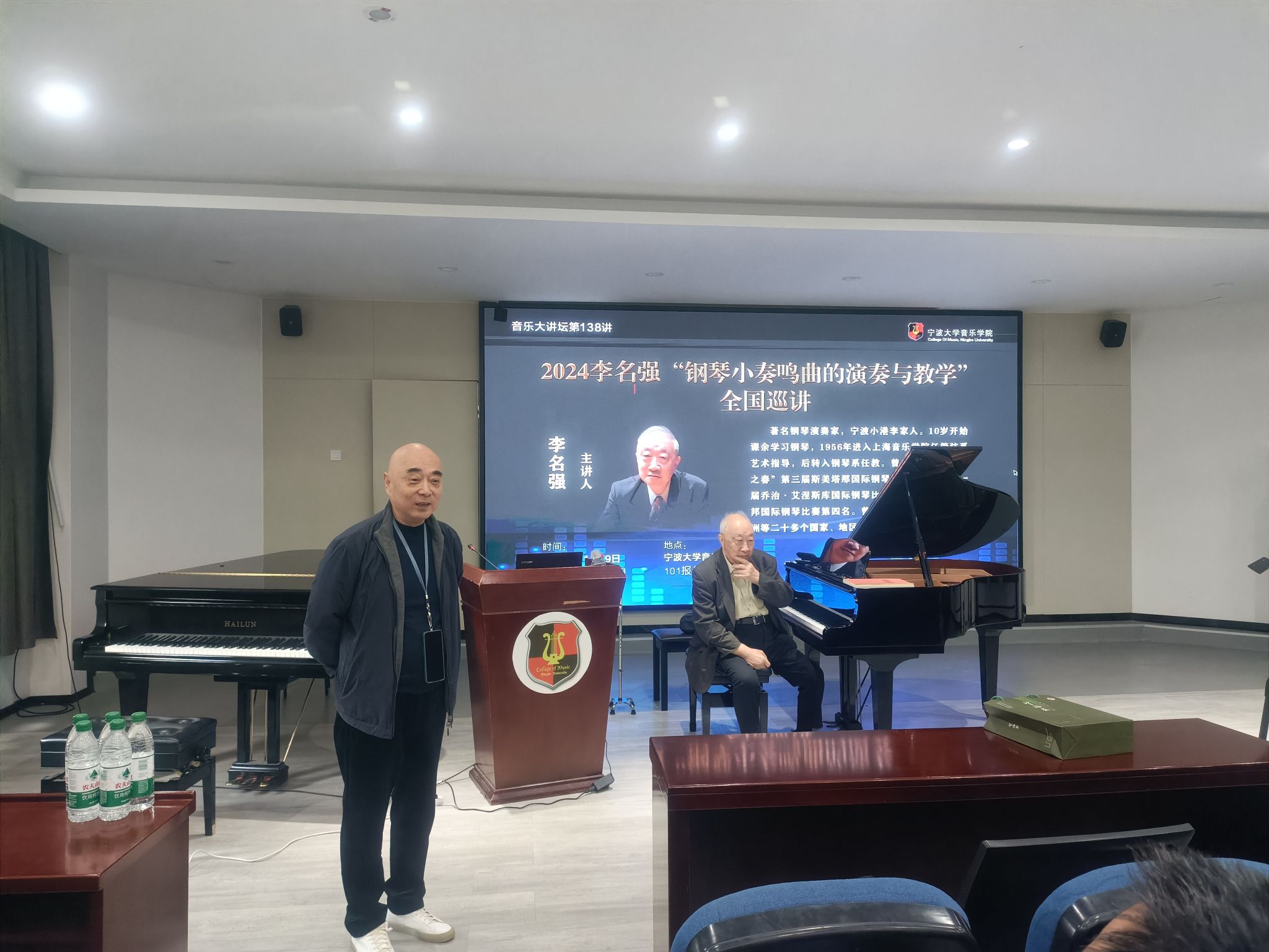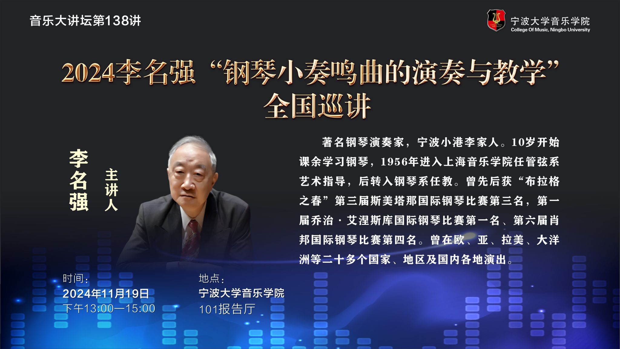2024年11月19日 下午,著名钢琴演奏家李名强在宁波大学音乐学院101报告厅举办《2024李名强“钢琴小奏鸣曲的演奏与教学”全国巡讲》大师班,音乐学院部分师生进行了现场观摩。李名强,著名钢琴演奏家,宁波小港李家人。10岁开始课余学习钢琴,1956年进入上海音乐学院任管弦系艺术指导,后转入钢琴系任教。曾先后获“布拉格之春”第三届斯美塔那国际钢琴比赛第三名,第一届乔治·艾涅斯库国际钢琴比赛第一名、第六届肖邦国际钢琴比赛第四名。曾在欧、亚、拉美、大洋洲等二十多个国家、地区及国内各地演出。