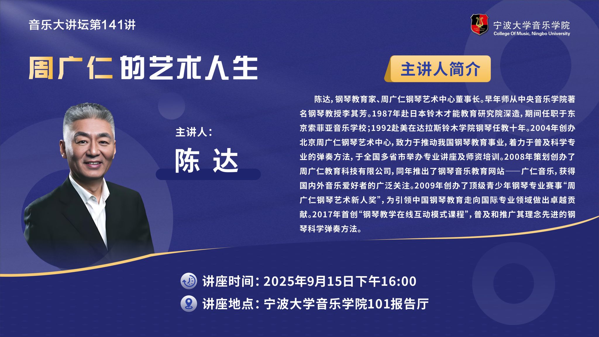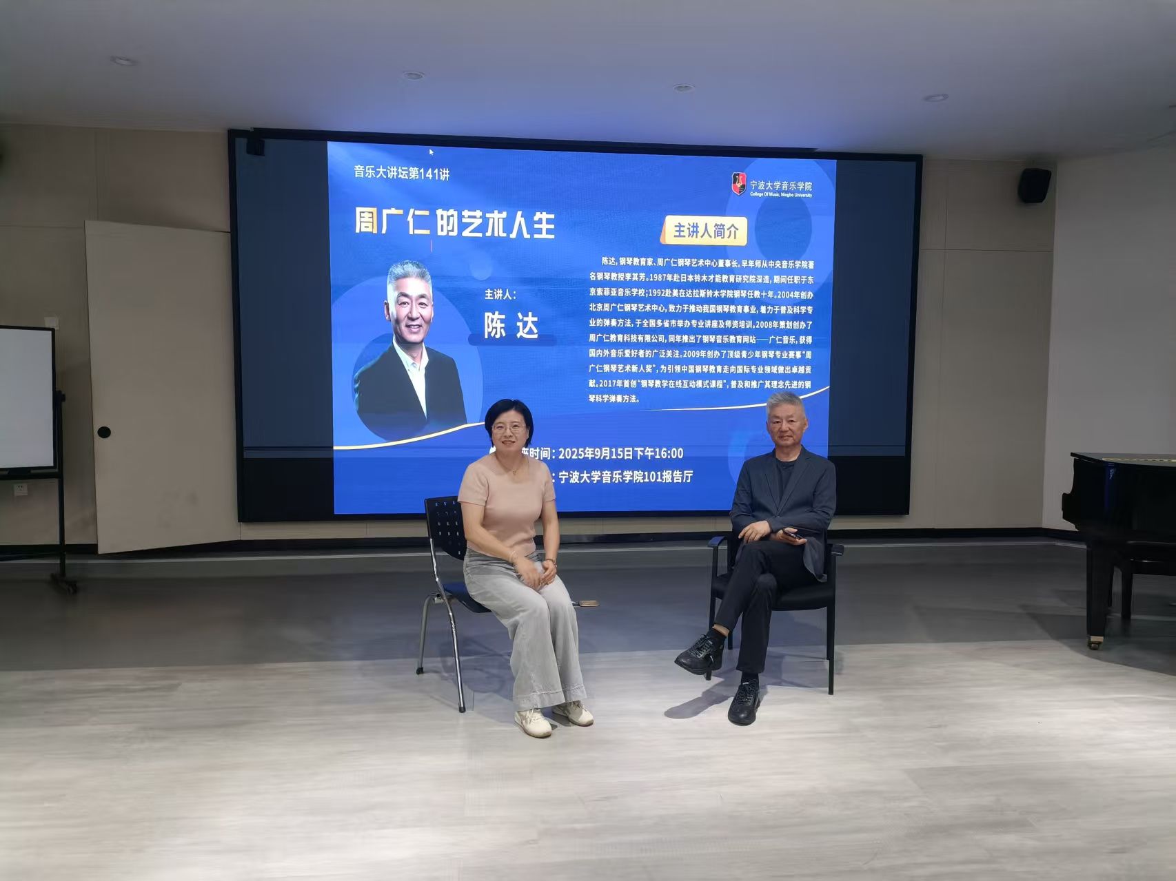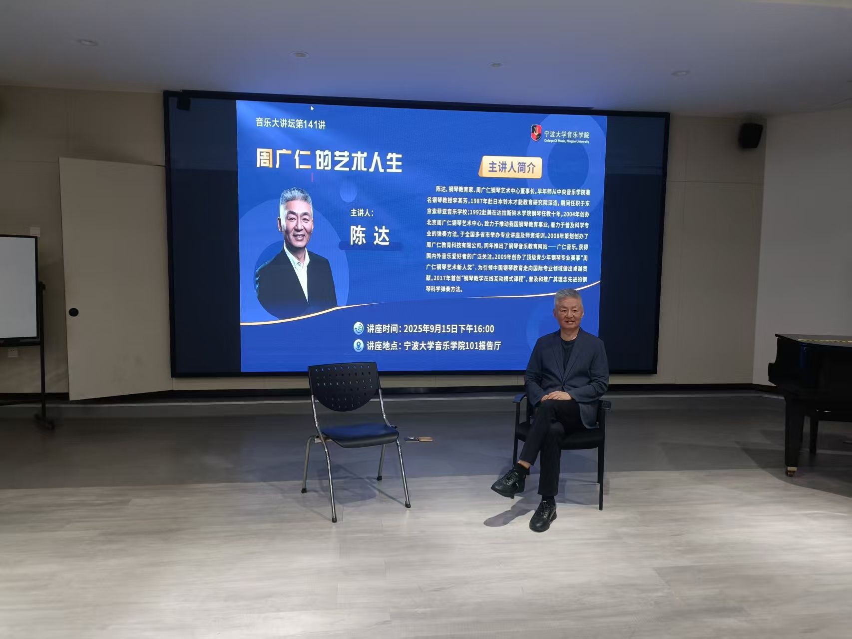 2025年9月15日,音乐学院邀请钢琴教育家、周广仁钢琴艺术中心董事长陈达做客音乐大讲坛第141讲,为学院师生做题为《周广仁的艺术人生》的学术讲座。陈达,钢琴教育家、周广仁钢琴艺术中心董事长。早年师从中央音乐学院著名钢琴教授李其芳。1987年赴日本铃木才能教育研究院深造,期间任职于东京索菲亚音乐学校;1992赴美在达拉斯铃木学院钢琴任教十年。2004年创办北京周广仁钢琴艺术中心,致力于推动我国钢琴教育事业,着力于普及科学专业的弹奏方法,于全国多省市举办专业讲座及师资培训。2008年策划创办了周广仁教育科技有限公司,同年推出了钢琴音乐教育网站——广仁音乐,获得国内外音乐爱好者的广泛关注。2009年创办了顶级青少年钢琴专业赛事“周广仁钢琴艺术新人奖”,为引领中国钢琴教育走向国际专业领域做出卓越贡献。2017年首创“钢琴教学在线互动模式课程”,普及和推广其理念先进的钢琴科学弹奏方法。