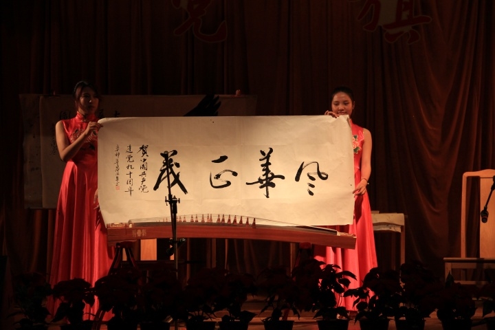 蓝陈军、李健两位同学合作,在短短5分钟的时间内,现场作画《大鹏展翅》、书法《风华正茂》,向党的生日献礼,赢得了观众们的阵阵掌声。最后,校红歌会也带来了大合唱《鼓浪屿之波》,为晚会画上了一个完满的句号。