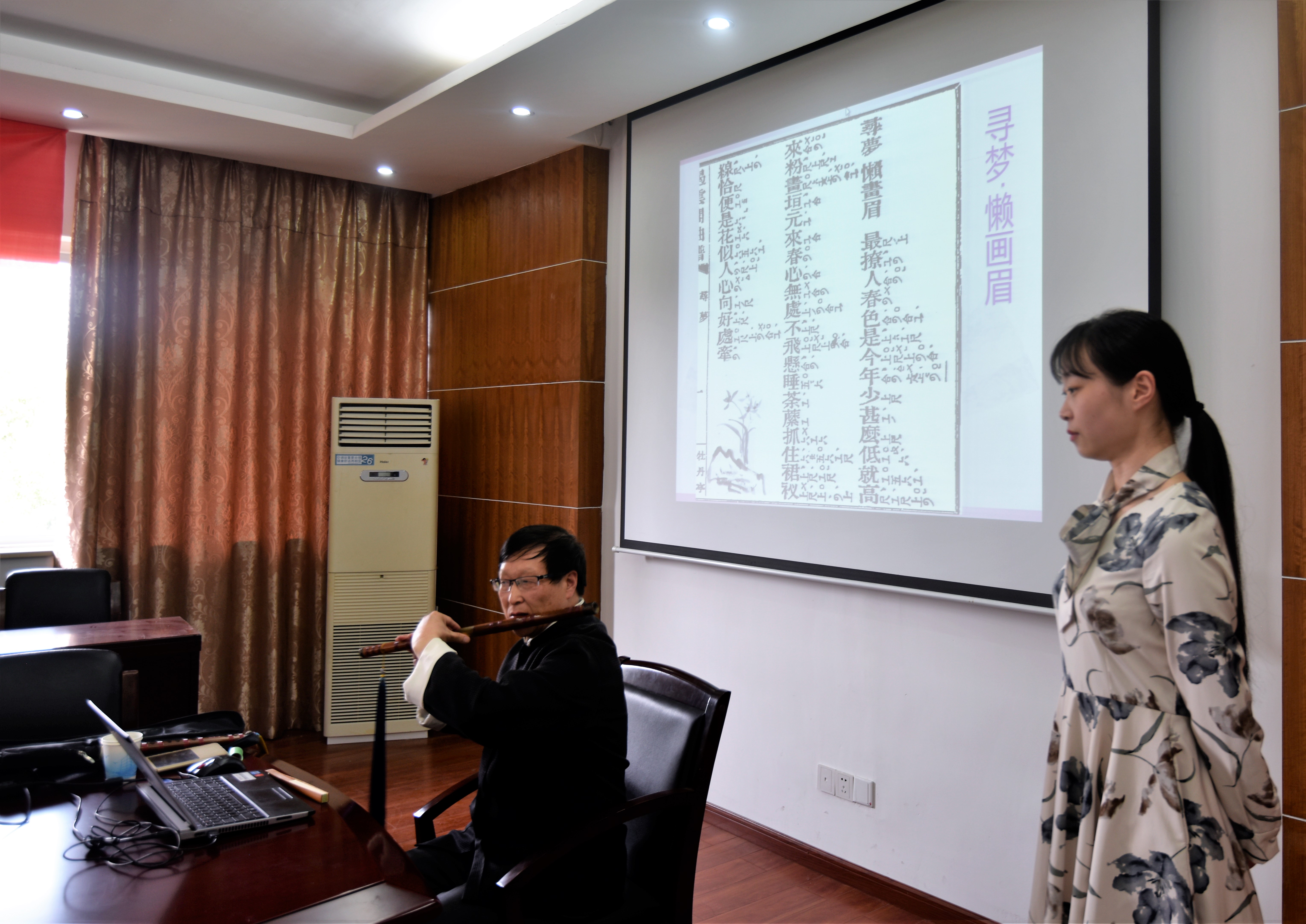 周秦教授的讲座由《牡丹亭·游园》、杜丽娘《寻梦》、林冲《夜奔》等曲谱分析导入,通过对曲牌、宫调、腔格和口法等方面的阐微释疑,为在场师生铺展出一幅幅昆曲艺术的饱蘸听觉、视觉与意韵之美的历史人文画卷。讲座中,周秦教授亲自擪笛奏曲,并与女儿周南合作对经典唱段进行了示范表演,技艺之精湛不仅获得了在场师生热烈的掌声,也让大家领略到周秦教授数十年理论研究与舞台演出的深厚功力。周秦教授融昆曲理论研究、舞台演出实践和本科、硕士、博士学历层次的教育事业为一体,是学术与才情兼长并美、造诣极深的学界大家。周教授所奉献的这场精神盛宴,不仅令全院师生大获裨益,亦为我院中国传统音乐方面的教学实践起到重要的推动作用。(杨红光 陆敏惟)