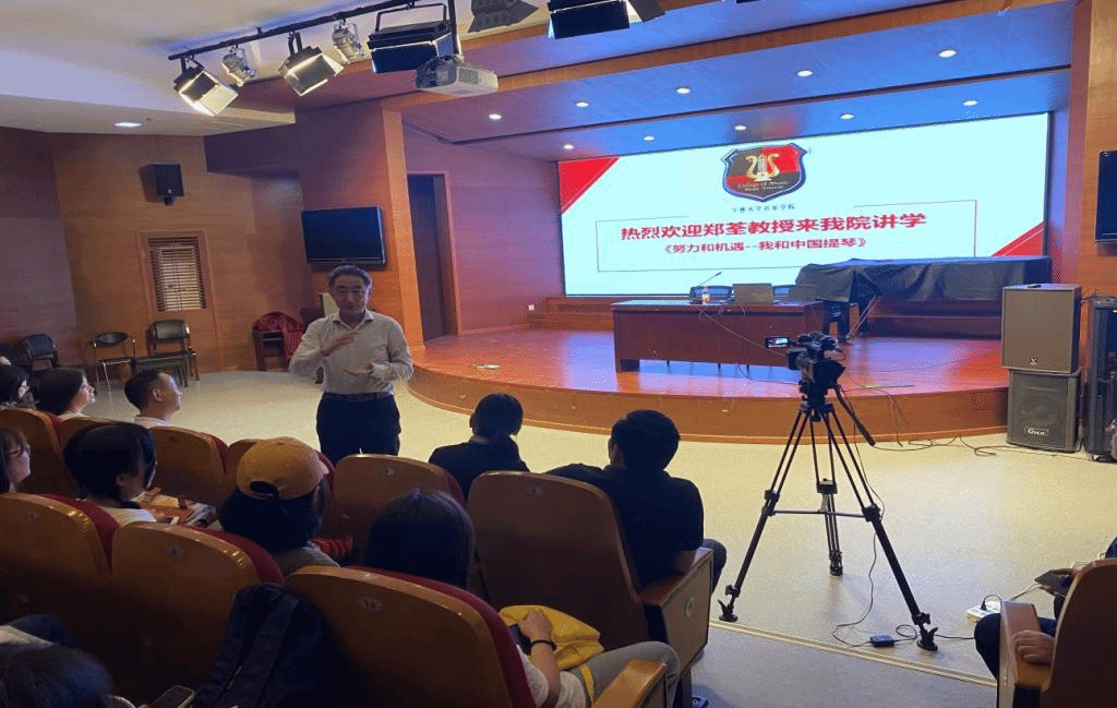 2021年10月9日下午,国际提琴制作大师、中国提琴制作学派开创者、中央音乐学院提琴制作研究中心创始人郑荃,作客宁波大学音乐大讲堂,在宁波大学西区小音乐厅为宁大师生带来一场以《努力和机遇——我和中国提琴》为题的讲座。讲座由江北区委宣传部、宁波大学音乐学院、民盟宁波大学委员会主办,由宁波音乐港、音乐宁波帮研究中心承办。宁波大学音乐学院院长俞子正、党总支书记屠春飞、宁波音乐港文化发展有限公司总经理方斌与音乐学院教师生代表100多人现场聆听交流。