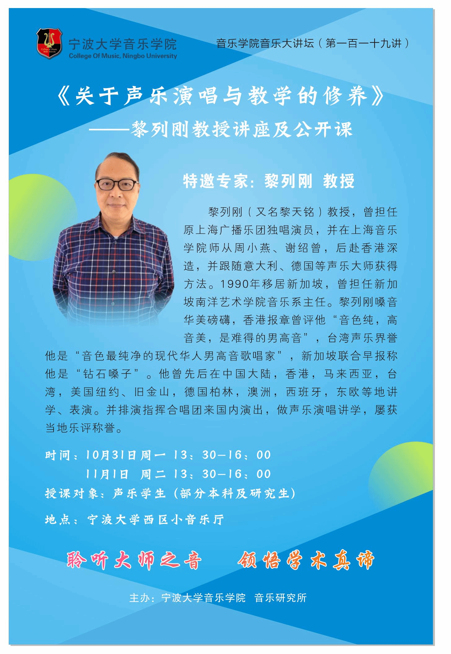 2022年10月31日-11月1日,男高音歌唱家黎列刚(黎天铭)教授做客宁波大学,在宁波大学西区小音乐厅为我院进行了题为《关于声乐演唱与教学的修养》的学术讲座。讲座内容从“咬字要规范、把歌唱气息变成平时生活的常态、把高位置的发声作为生活的常态、关于歌唱的意境”四个方面与师生们分享了自己的艺术实践与理论所获,并于师生们进行了问答的互动交流。公开课环节中,黎教授耐心细致地对四位本科、四位研究生从歌唱语言、发声技巧、艺术表达等方面进行了悉心指导。