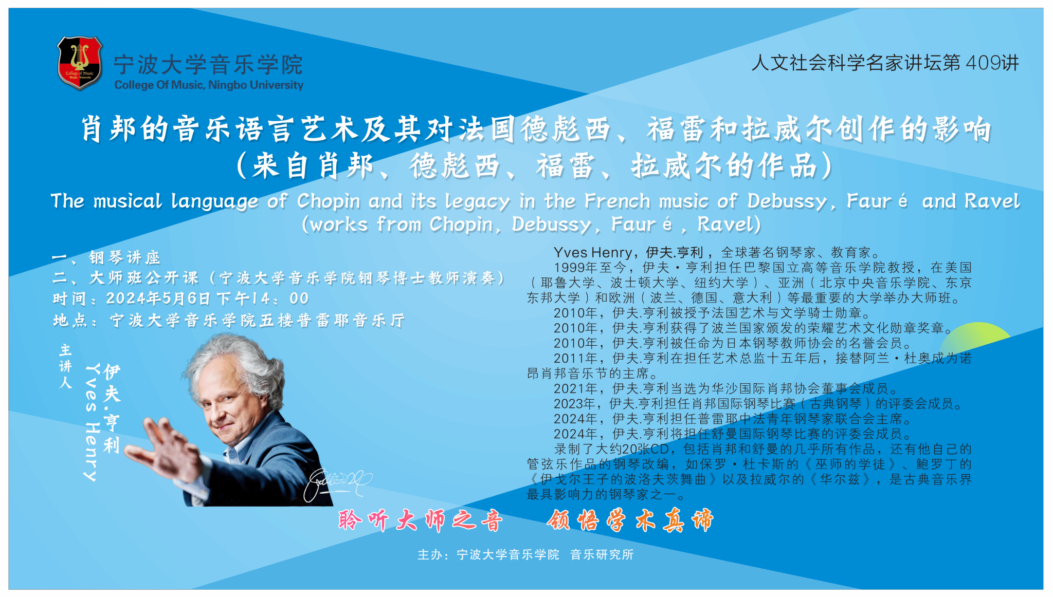 2024年5月6日下午14:00,全球著名钢琴家、教育家伊夫·亨利(Yves Henry)教授在宁波大学音乐学院五楼普雷耶音乐厅为音乐学院师生带来了主题为《肖邦的音乐语言艺术及其对法国德彪西、福雷和拉威尔创作的影响(来自肖邦、德彪西、福雷、拉威尔的作品) The musical language of Chopin and its legacy in the French music of Debussy, Fauré and Ravel(works from Chopin, Debussy, Faur é, Ravel)》的钢琴讲座及大师班公开课。