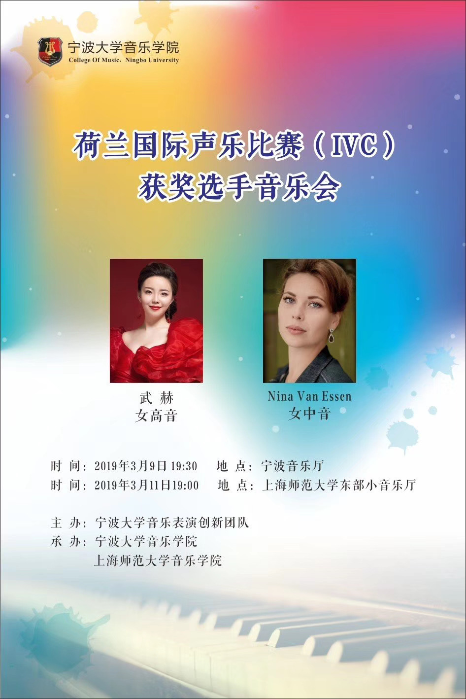 由音乐学院和宁波大学表演艺术创新团队主办的“荷兰国际声乐比赛获奖选手音乐会”分别于2019年3月9日和3月11日在宁波音乐厅和上海师范大学东部小音乐厅成功举办。中国籍女高音武赫、荷兰籍女中音Nina Van Essen演唱了多首专业声乐作品。音乐学院张东方老师和刘子彧老师担任本场音乐会的钢琴艺术指导。