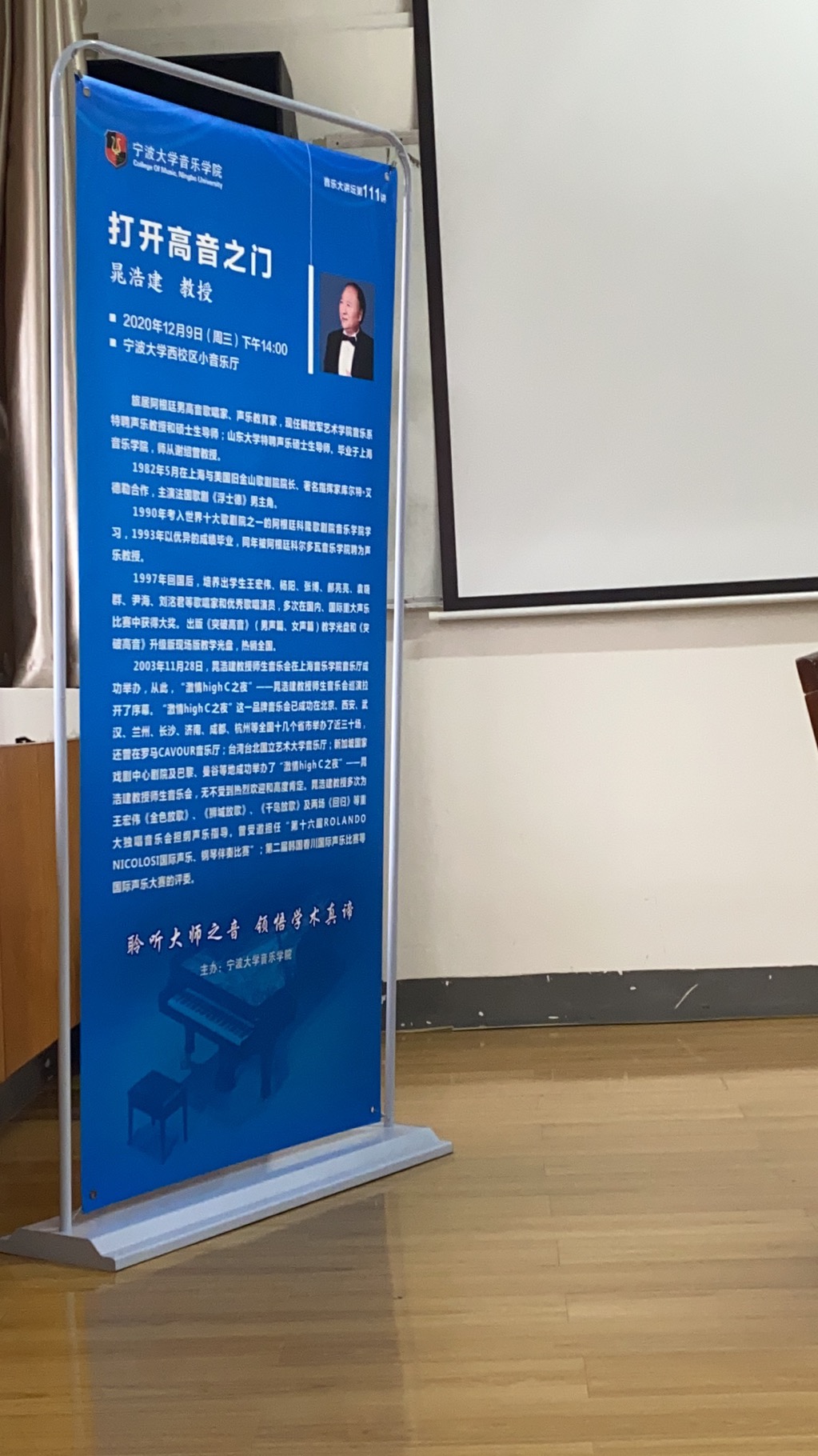 2020年12月9日下午2:00,晁浩建教授在宁波大学音乐学院载物楼518举办了名为《打开高音之门》的声乐学术讲座。晁老师用通俗易懂的语言、生动的授课方式、问答式的交流形式与老师同学们分享了演唱中解决高音难题的经验和方法。