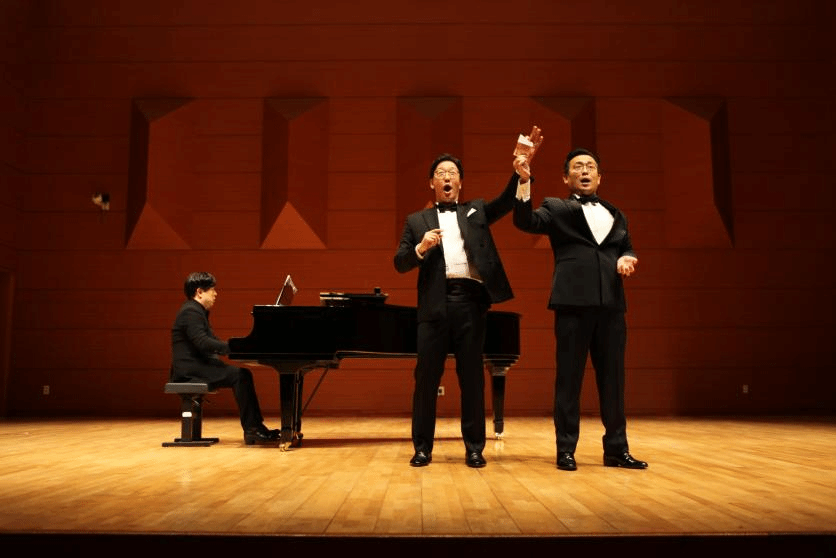 秋溪艺术大学男高音申智汉与男低音金志燮老师带来多尼采蒂歌剧《爱的甘醇》中的二重唱《Ardir! .. Voglio dire lo stupendo 》,两位老师默契配合,歌声交织碰撞,将歌剧里的情感纠葛诠释得扣人心弦,将音乐会推向又一个高潮。