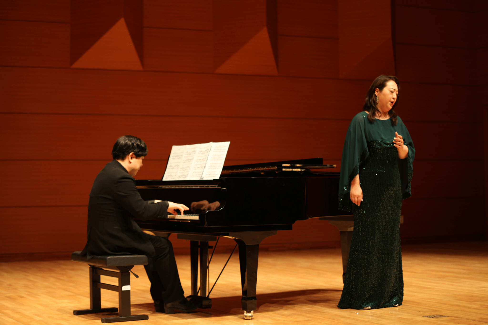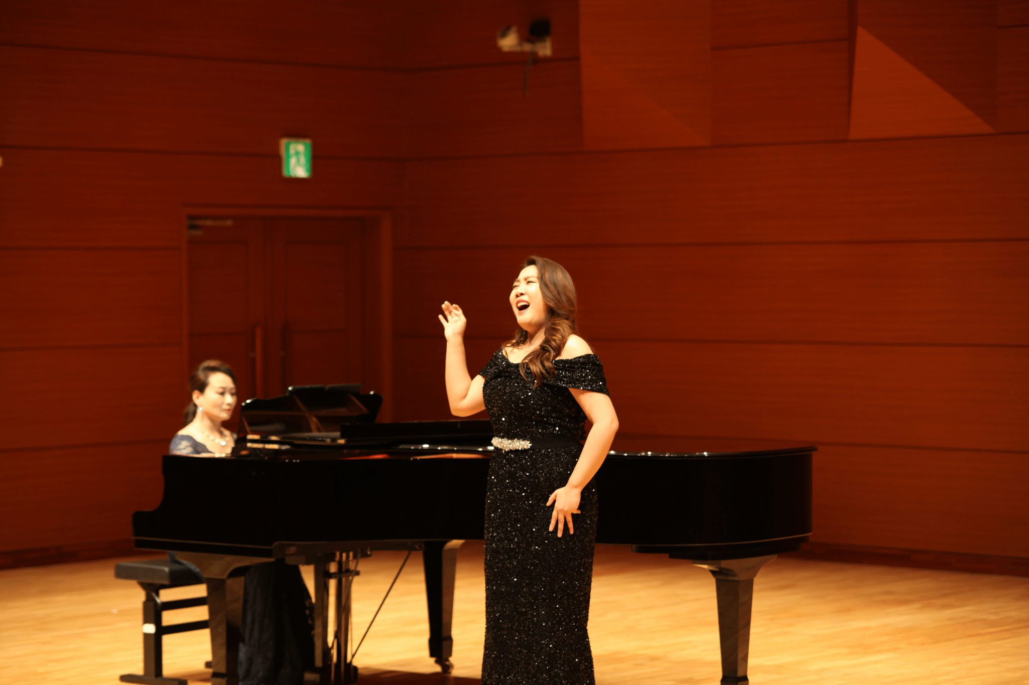 音乐会伊始,秋溪艺术大学的女高音洪洙英老师与女中音申成熙老师率先登场,以奥芬巴赫歌剧《霍夫曼的故事》中的《船歌》二重唱惊艳开场。她们的歌声如灵动的音符精灵,在音乐厅中轻盈跳跃,温柔舒缓的旋律瞬间将观众带入如梦如幻的音乐世界。